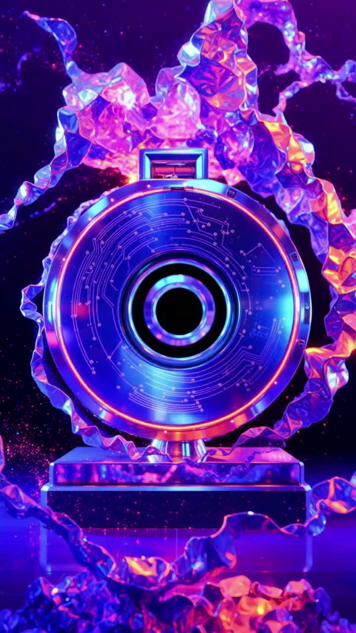 Broken glasses shattering then fading, mirrored shards multiplying reflections infinitely, soft neon bruises flickering in violet-blue fog, Low baritone winds coil through hollow metal pipes, Splashing sea-water collides with thick, syrupy drops falling on stainless steel, Submerged gusts of wind bend like warped tape, Velvet fabric swooshes against chilled chrome, Micro-beads scatter across a thin glass deck, rolling in spirals, Distant horses of foam crash rhythmically, Industrial hums pulse under deep, resonant heartbeats, Wet sand hisses beneath pressure, A rising choir of misty air and nebulæ swells into distorted synth haze, Sudden reverse-echo breaths, crackling static, a glowing sub-bass throb, All elements drift into a cold tidal reverb, swelling toward a metallic, anthemic climax
