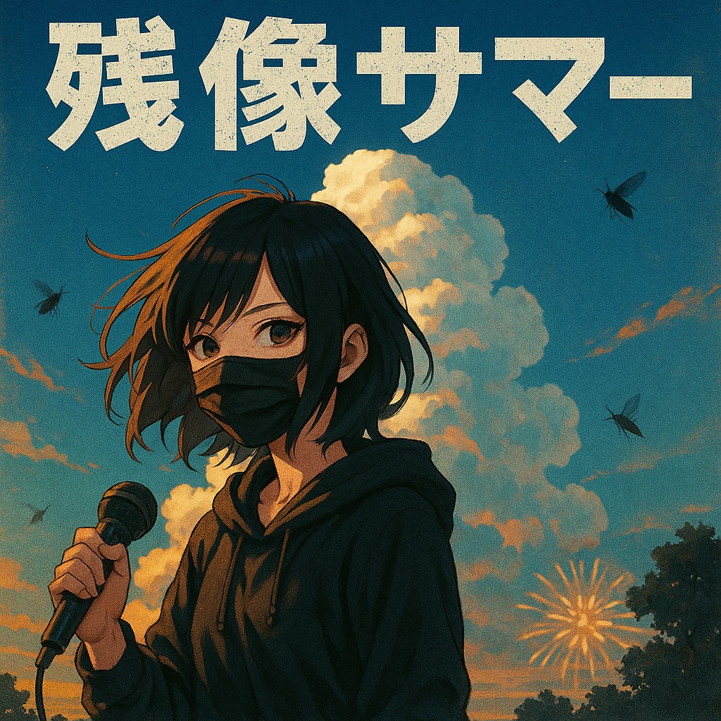 A powerful emotional J-rock ballad sung by a mysterious female vocalist in the style of Ado, Themes of nostalgia, childhood summer memories, and emotional pain in the present, Dynamic vocals with