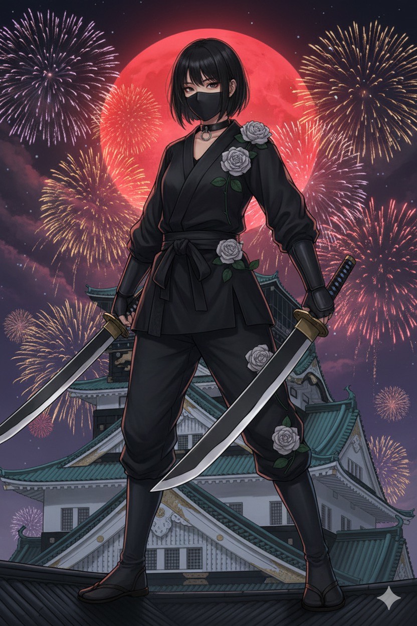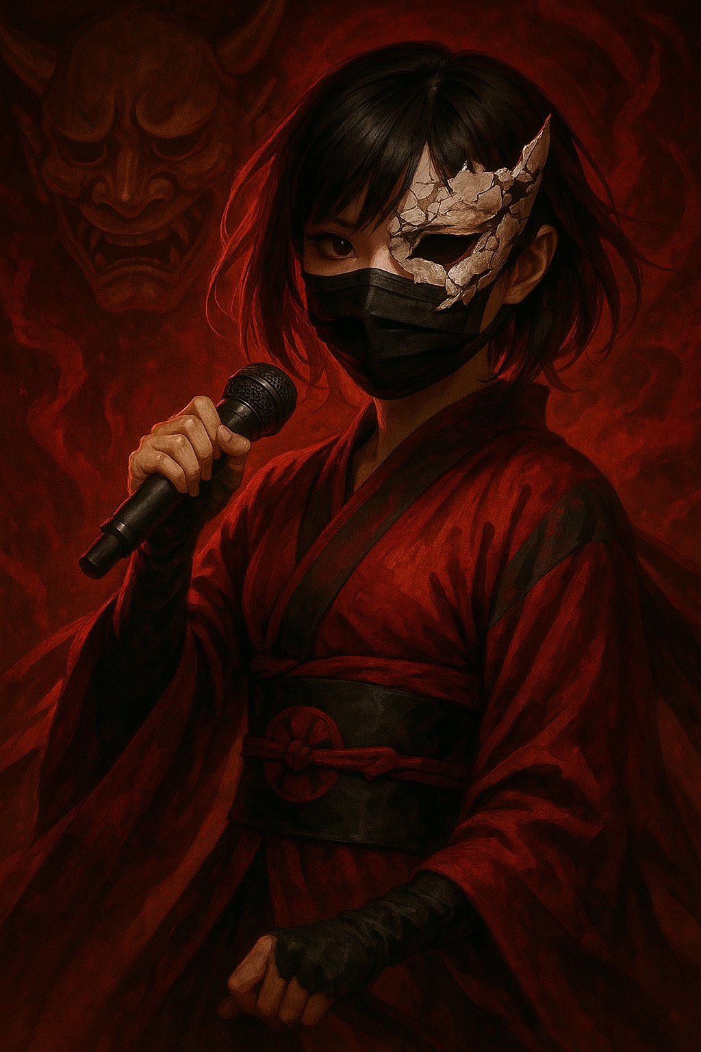 Japanese-style dark rock with fast tempo, Features traditional Japanese instruments like shamisen, shakuhachi, and taiko prominently, These instruments should remain audible and central, even during the intense rock chorus, Female vocals, dramatic and emotional, Inspired by anime battle themes and Japanese folklore, The sound blends aggressive electric guitars and drums with strong traditional elements