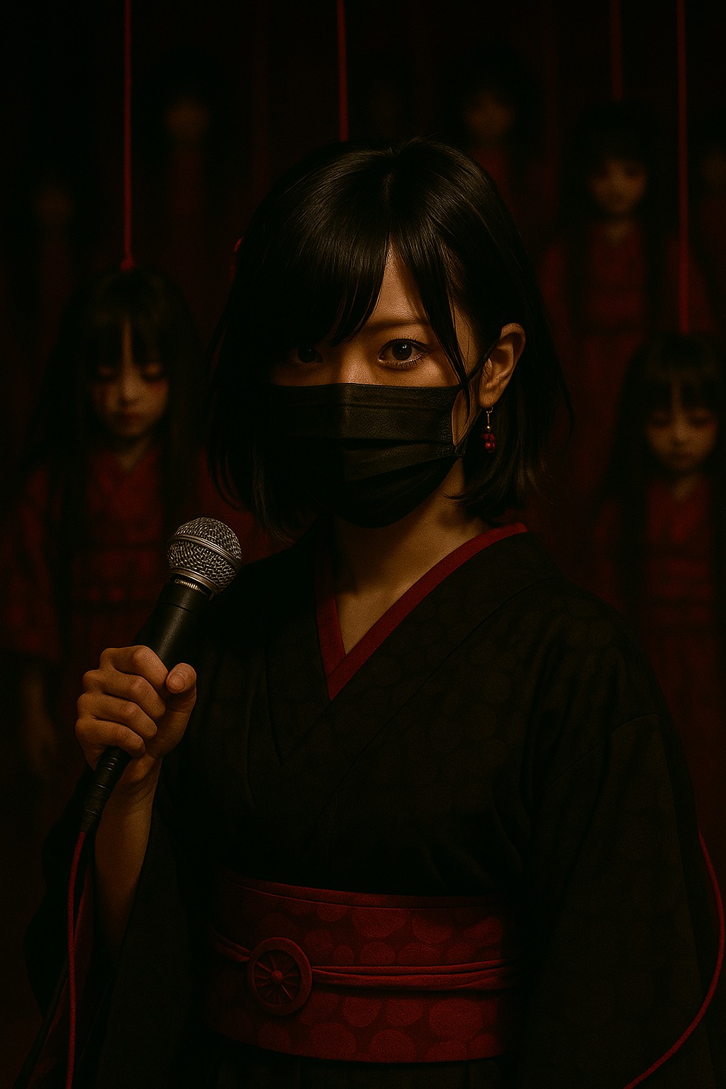 Prompt: A dark Japanese rock song with traditional instruments like shamisen and shakuhachi, Emotional female vocals and dramatic storytelling, Haunting melody, slow build-up, powerful climax, Prompt Strength: 65