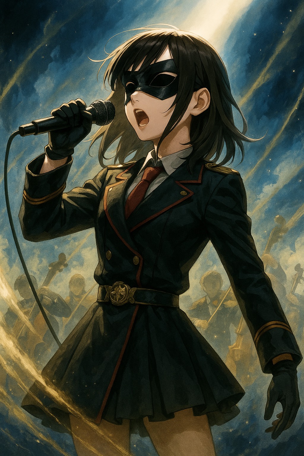 A powerful symphonic rock track featuring an emotional and intense female Japanese vocal in the style of Ado, The music begins with a dramatic orchestral intro and builds into distorted electric guita