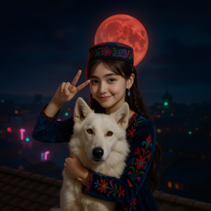 Story: On a full moon night, a girl sits on the roof gazing at the blood-red moon, Then a wolf appears, also sitting on the roof staring at the girl, It seems like they haven’t seen each other in ten years, and this might be their final meeting, Style: Uyghur night sky folk song, soft and unique future trap electronic dance music