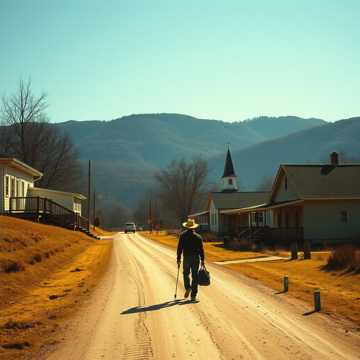 Relaxed ragtime Appalachian swing around 98 BPM built on alternating-bass fingerstyle guitar in G major with a gentle mountain storytelling groove, Upright bass provides a warm pulse while mandolin adds subtle offbeat chop that keeps the rhythm moving without overpowering the narrative, Fiddle lines weave melodic Appalachian phrasing that rises between vocal lines and expands in the chorus, The lead vocal should be an earthy Appalachian baritone with a conversational storytelling tone, slightly gravelly and relaxed, delivering the lyrics like a traveler recounting encounters along a small-town road, The performance should feel intimate and communal, emphasizing the interconnected nature of life in a rural holler where everyone knows everyone and even a passing traveler becomes part of the community’s shared story