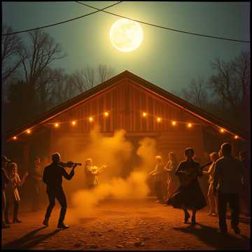Up-tempo ragtime Appalachian swing at 112 BPM centered in D major, driven by alternating-bass fingerstyle guitar that creates a rolling dance groove, Upright bass reinforces the bounce while mandolin provides crisp offbeat chop that locks the rhythm into a lively mountain dancehall pulse, Fiddle weaves energetic Appalachian melodies and playful breaks that lift the momentum of each section, The lead vocal should be an earthy Appalachian baritone with a relaxed, humorous storytelling delivery, sounding like a charismatic bandleader recounting a legendary night in the holler, The performance should feel loose, communal, and joyful, with crowd stomps, laughter, and callouts blending naturally into the music to create the sense of a packed room dancing well past midnight