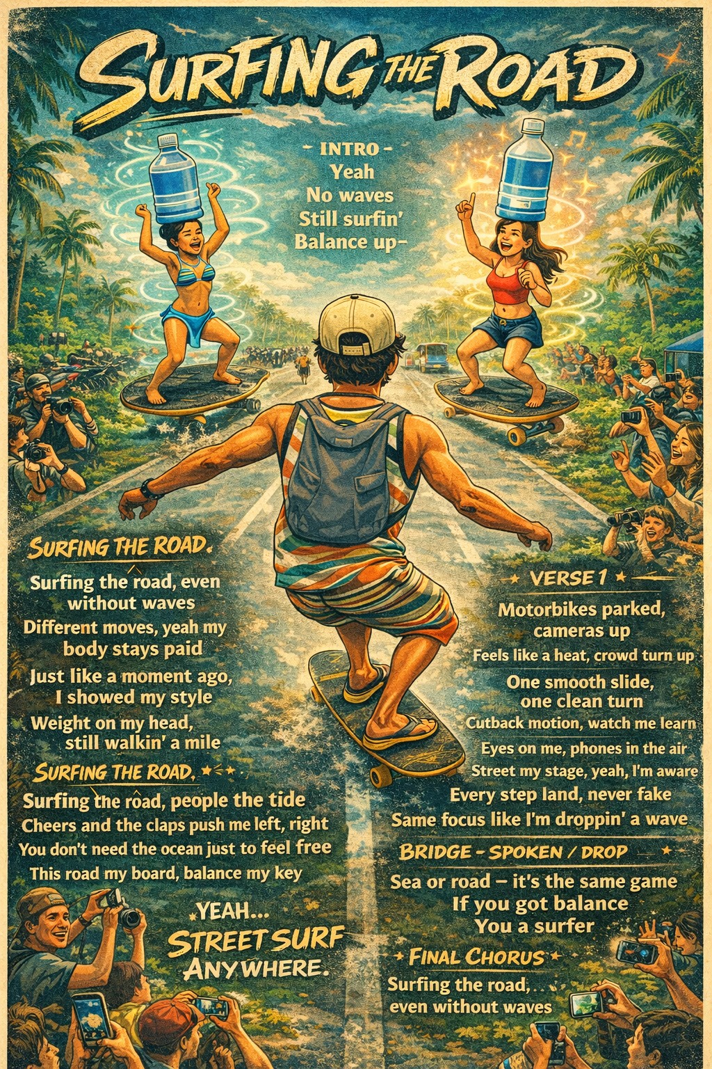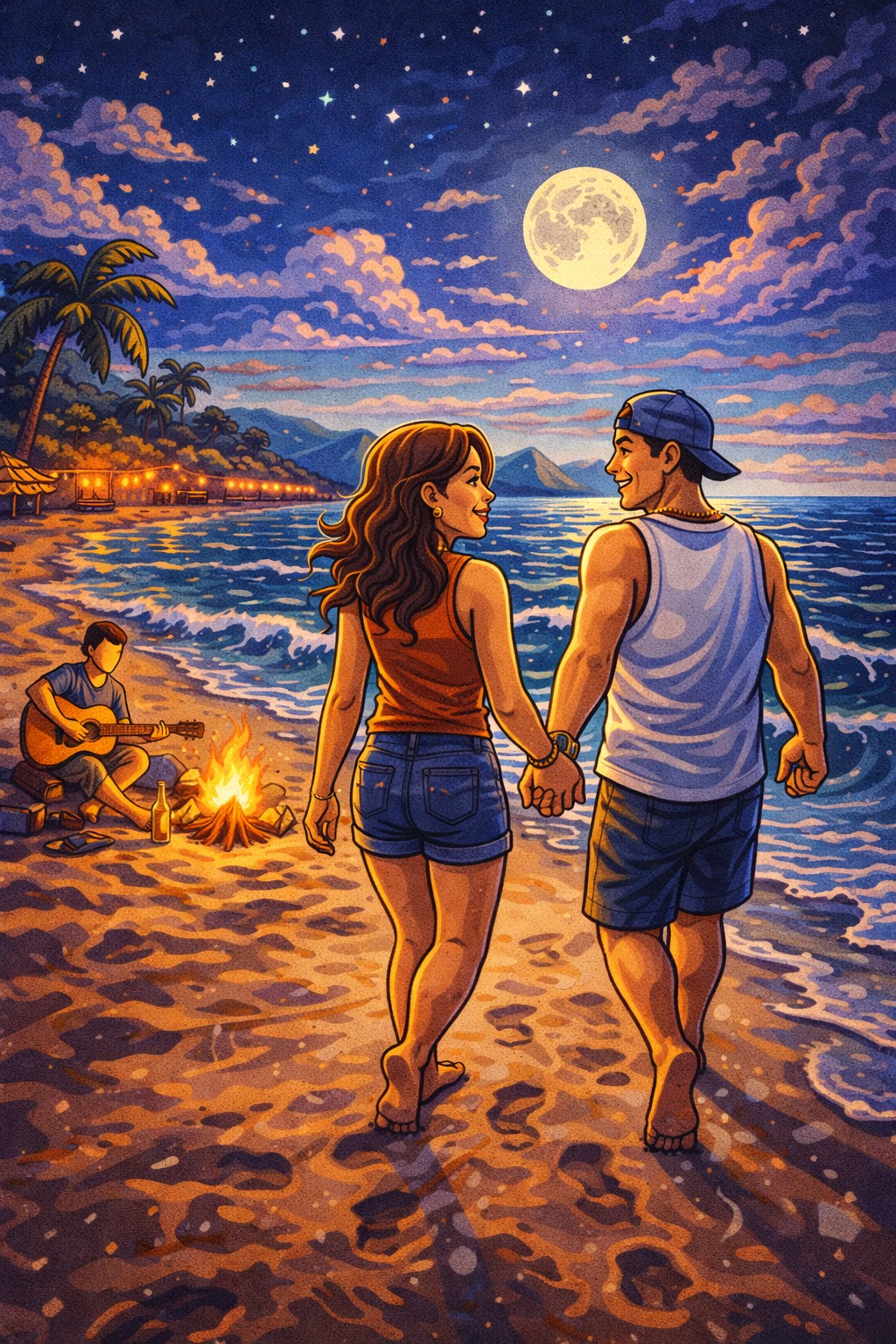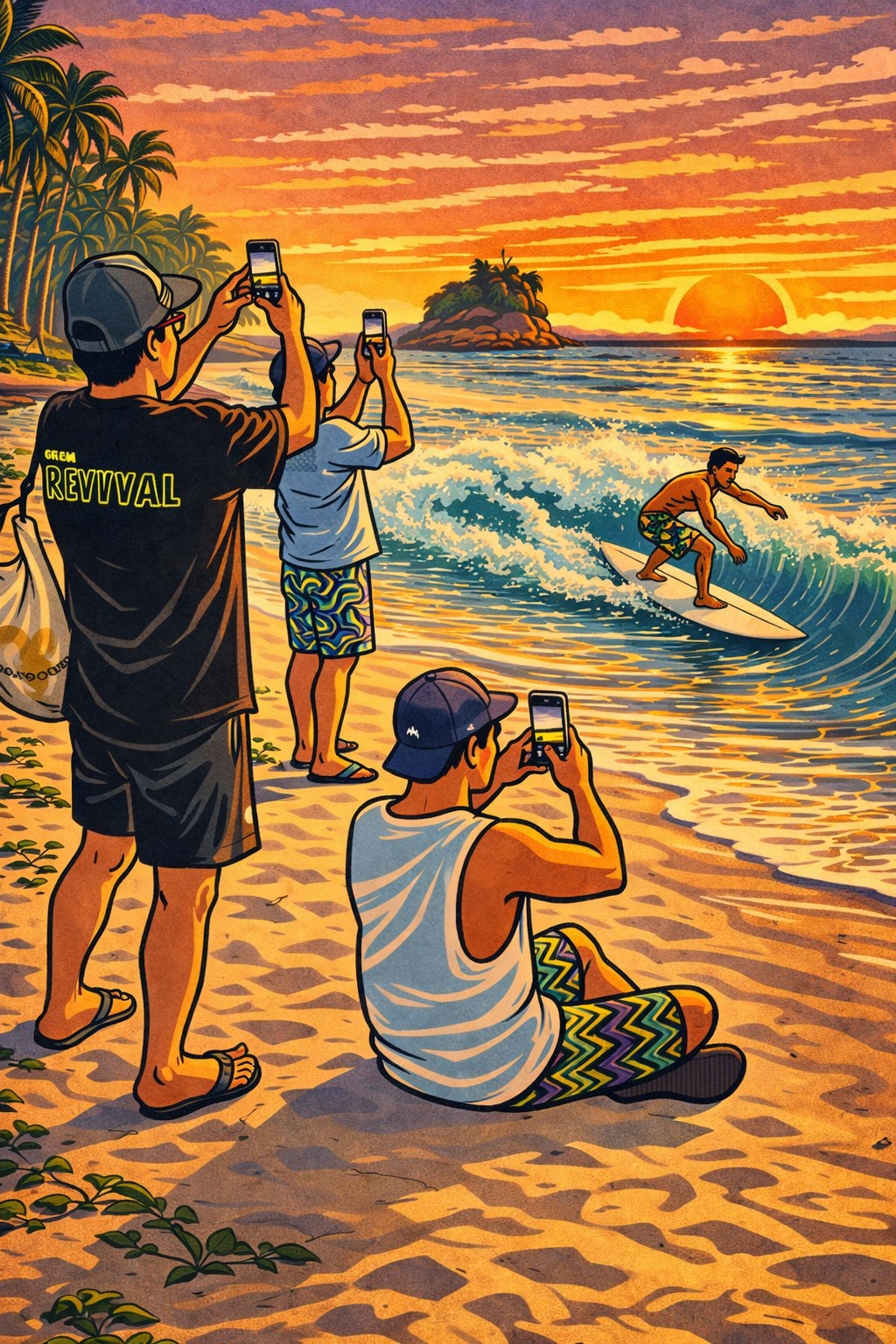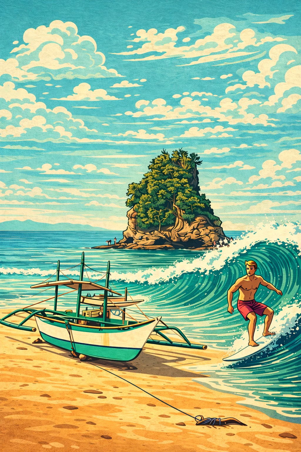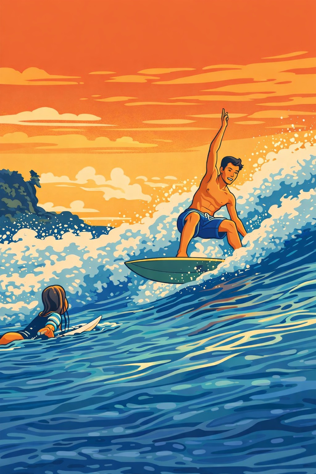 Surf chill, lo-fi, tropical vibe, 85–95 BPM, warm guitar, soft beat, male vocal, relaxed, dreamy, loopable hook, island sunset mood