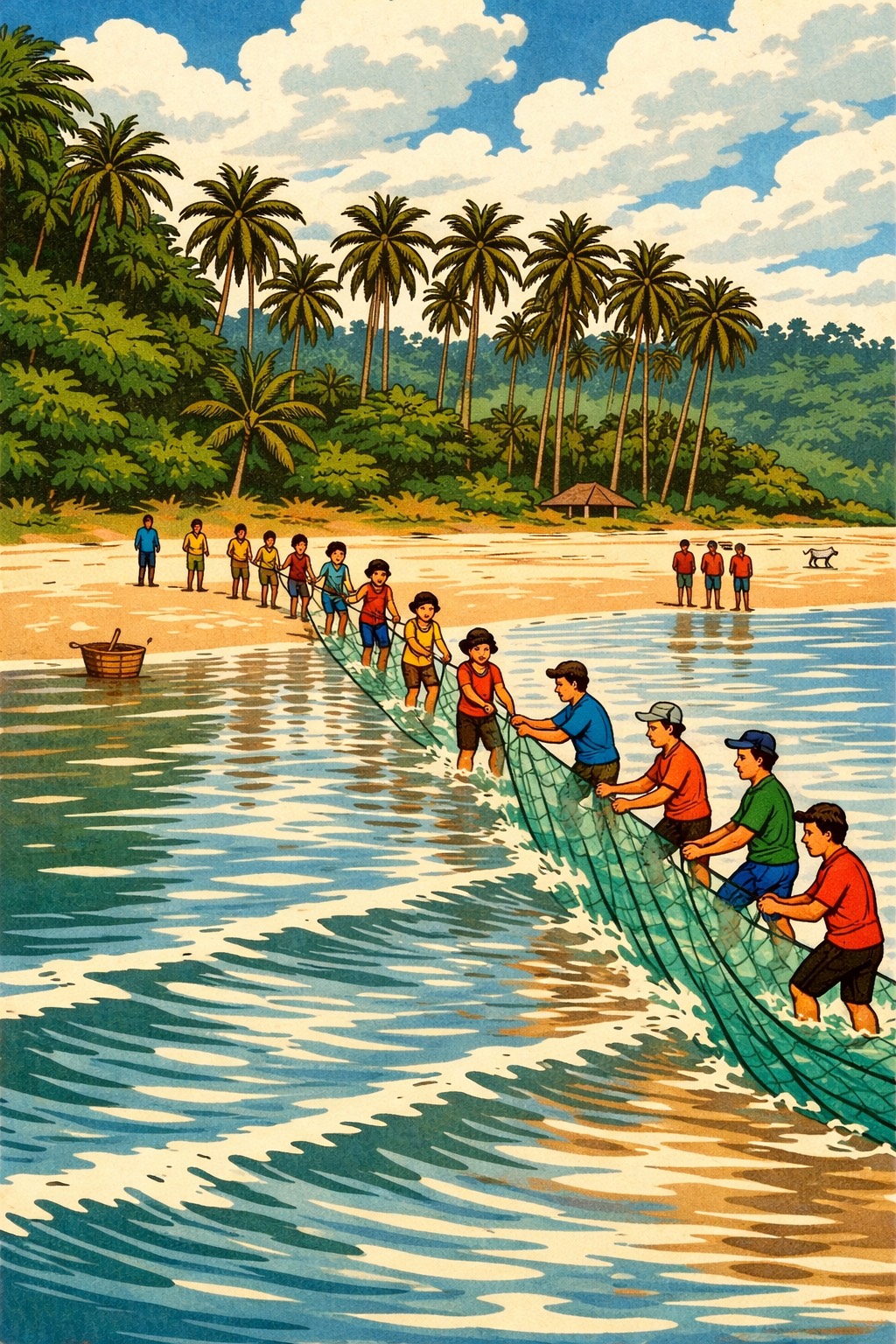 Upbeat Afrobeats, island groove, warm percussion, rhythmic guitar plucks, bouncy bass, joyful male vocal, beach atmosphere, communal chant feel