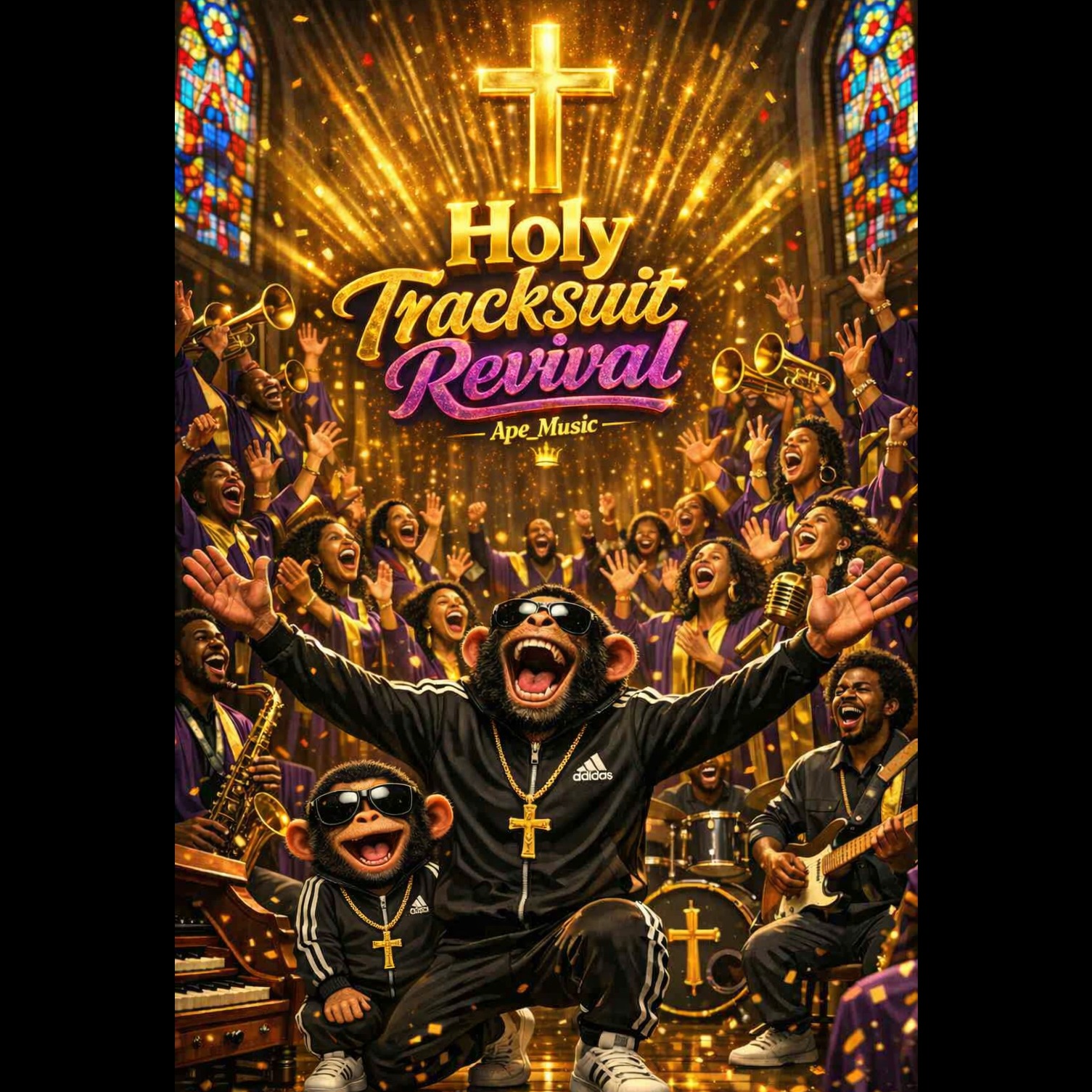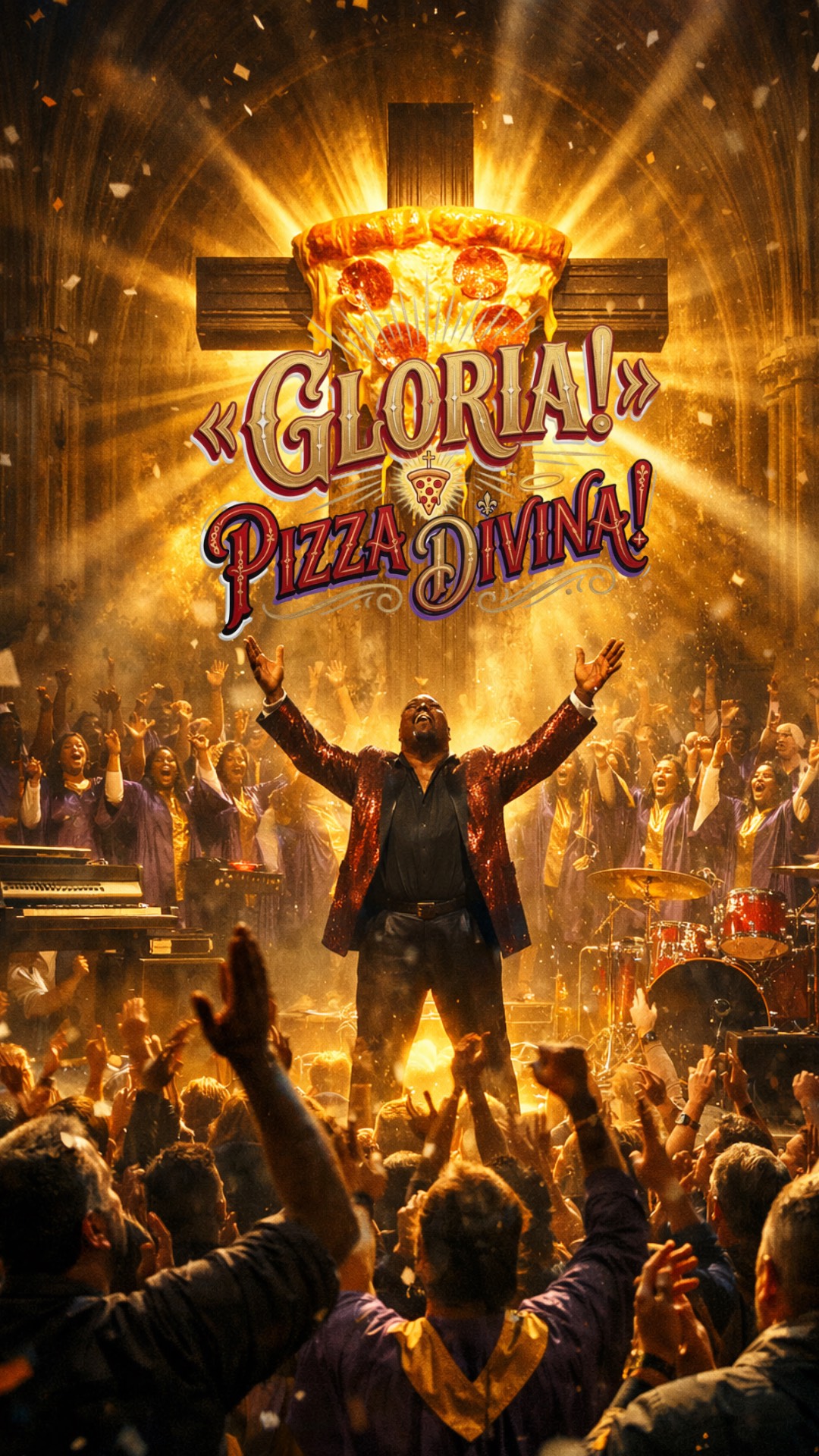 Powerful Gospel Choir (50 background singers), Soulful Lead Vocals (charismatic gospel preacher style), LIVE SHOW atmosphere, Hammond B3 Organ, Call and Response, Stomp and Clap Rhythm, Emotional Key Change, Gospel + Metal Fusion, Arena Performance Energy, crowd noise, audience clapping and shouting, big stage reverb, live recording feel, raw energy, dynamic choir swells, interactive preacher and audience, humorous and over-the-top delivery