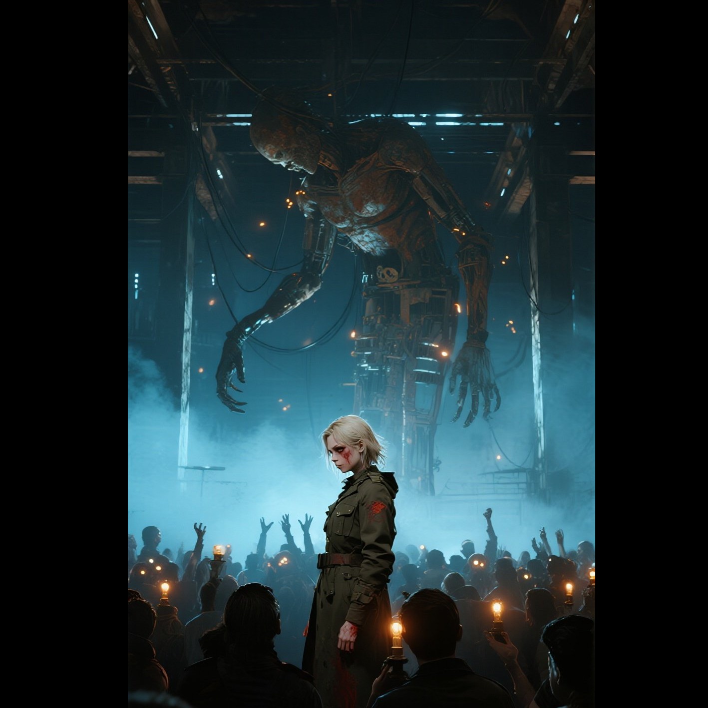 Female lead vocal, Breven style: gospel fused with industrial post-punk, Tempo ~105 BPM, Intro: distant church bells morph into metallic hits, low electrical hum, faint crowd murmur, Groove: stomp and clap with mechanical percussion, tight kick, dry snare, Bass: Hammond-style organ blended with distorted synth low end, Choir: large gospel choir, call-and-response, clean first, slowly detuning into chaos, Verses: soft preacher tone, intimate, breathy, Build: rising choir, organ swells, tension drones, Chorus: explosive, layered choir, saturated, ecstatic yet unsettling, Add glitch cuts, feedback squeals, tape warble, sudden silence drops, Bridge: whispered voices, reversed choir, near-collapse, Final: overlapping chants, controlled chaos peak, Outro: choir fades into cold industrial noise, broken signal, Atmosphere: ritual, hypnosis, collective breakdown, Clean but heavy mix, wide stereo, punchy low end
