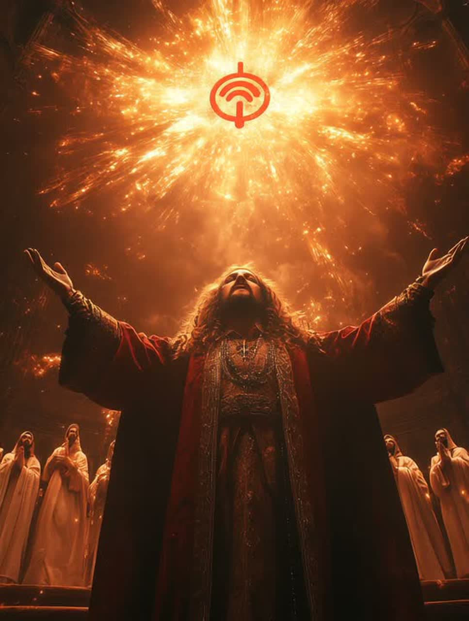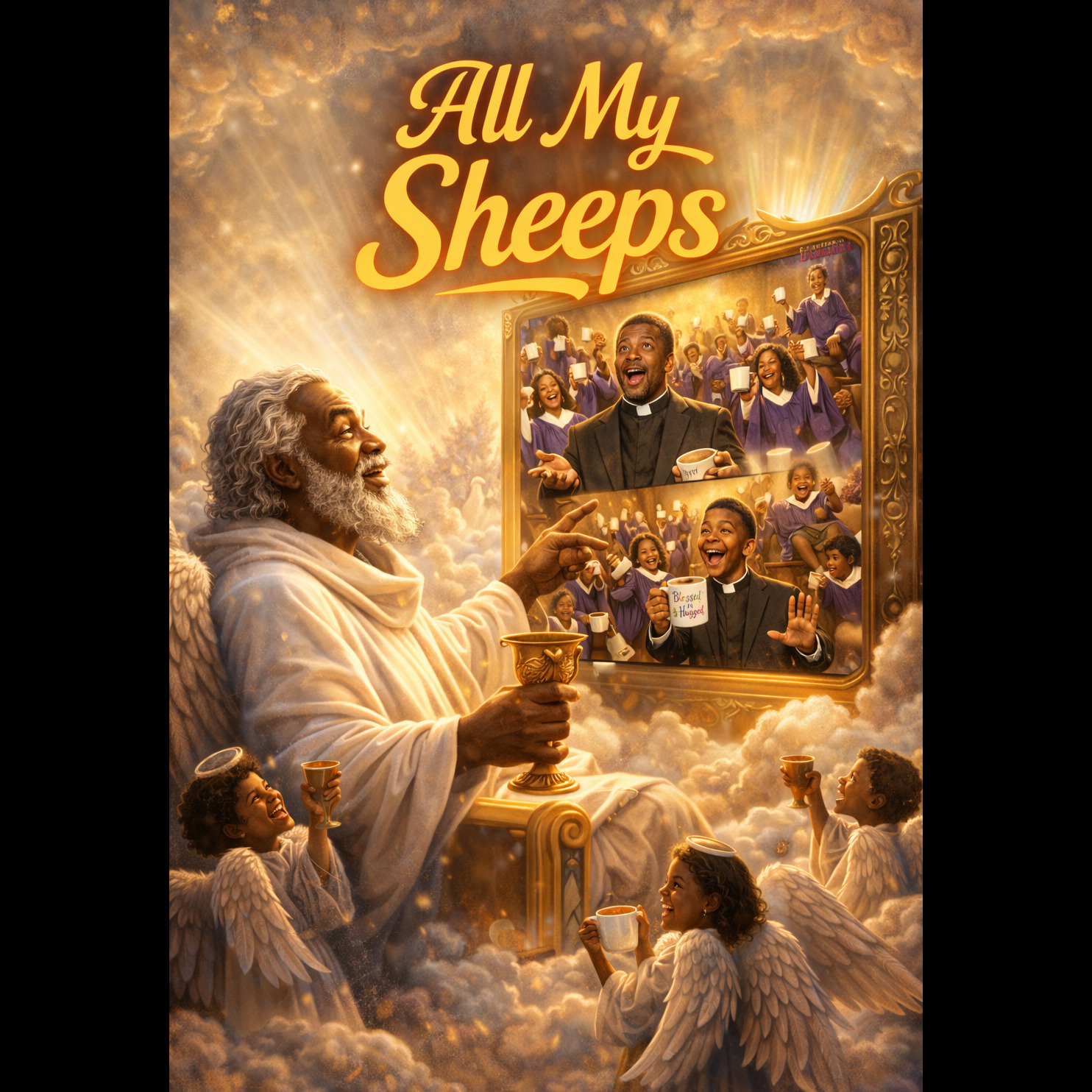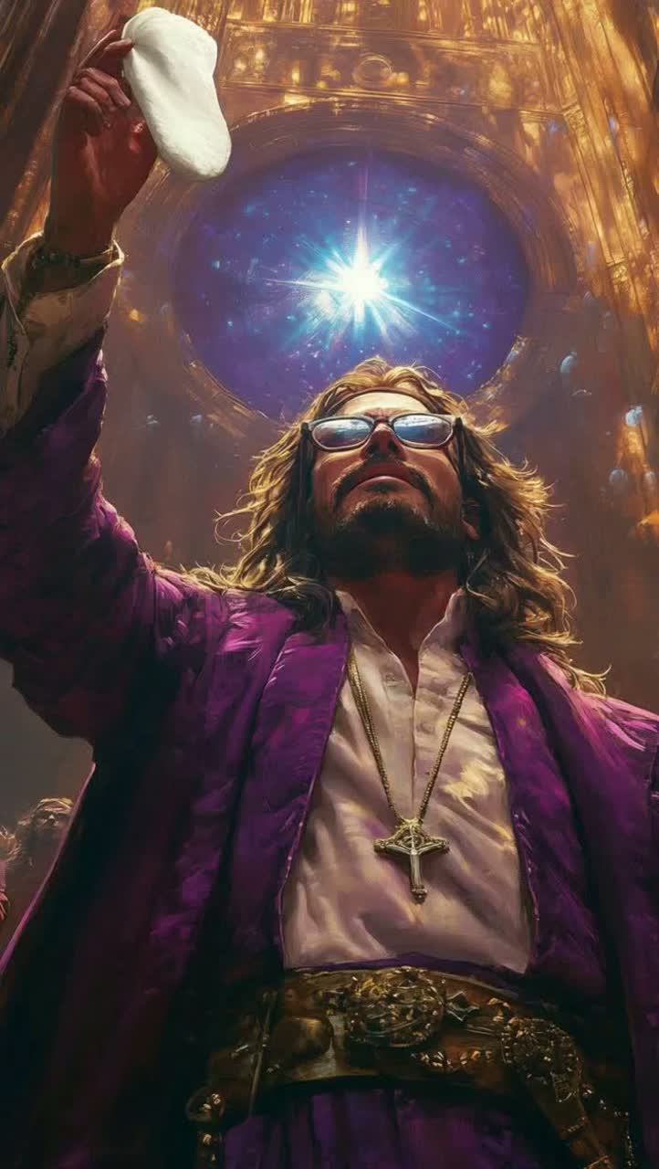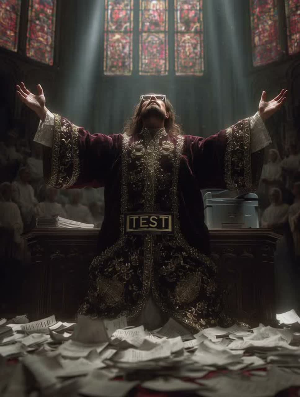 Epic cinematic gospel fused with dark ambient drone, no clear rhythm, slow evolving textures, massive reverbs, celestial choir, deep male divine lead voice, angelic harmonies, industrial undertones, metallic textures, saw-like synths, low rumbling bass, dramatic pauses, spoken word elements, eerie yet majestic atmosphere, biblical references, storytelling tone, gradually intensifying, final section more chaotic and playful, contrast between divine authority and subtle humor