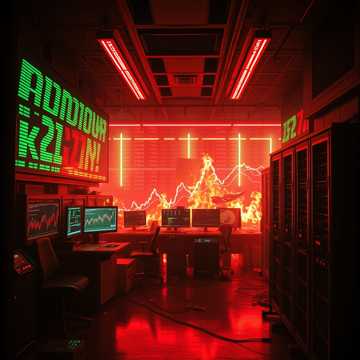 driving industrial techno, aggressive dark synthpop, fast tense rhythm, stock ticker sounds, male and female vocals, dramatic, relentless beat, financial collapse, panic, glitchy