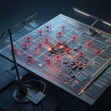 dark cinematic electronic, heavy hybrid orchestral, asymmetric rhythms, powerful but cold, male and female vocals, sense of overwhelming superiority, tense, relentless, tactical warfare, drones and machines vs humans, dramatic, ominous