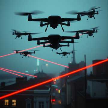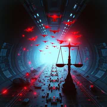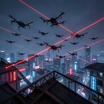 epic dark cyberpunk, heavy cinematic drums, buzzing drone swarms, aggressive synths, male and female vocals, feeling of oppression and surveillance, militaristic rhythm, marching, dystopian sci-fi, ominous, grand and menacing