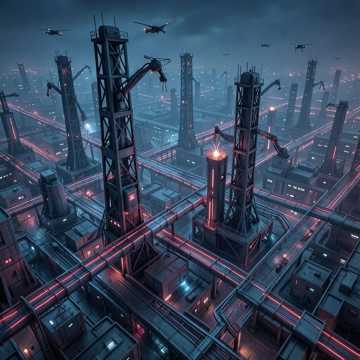 industrial cyberpunk, mechanical rhythm, marching robotic drums, cold metallic synths, epic dark electronic, powerful male and female vocals, sense of construction and domination, factory ambience, dystopian, triumphant yet ominous
