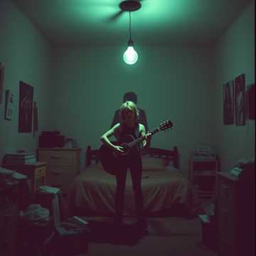female vocalist, chaotic lesbiancore, cynical indie folk, raw aggressive acoustic guitar, green haired rebel energy, messy, poignant, intimate, sarcastic, lo-fi