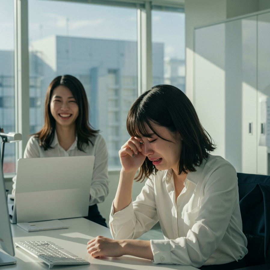Japanese female vocal group, idol pop, dramatic orchestral pop, minor key, powerful unison vocals, speak-to-sing intro, building tension, anthemic chorus, strings arrangement, sharp snare, driving beat, emotional bridge with sparse piano, key change in final chorus, socially conscious lyrics, cinematic, empowering yet melancholic