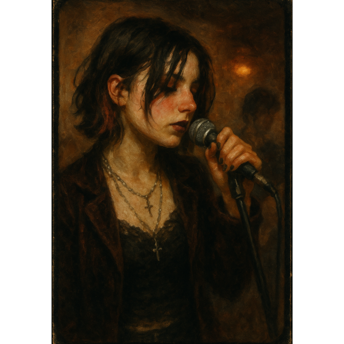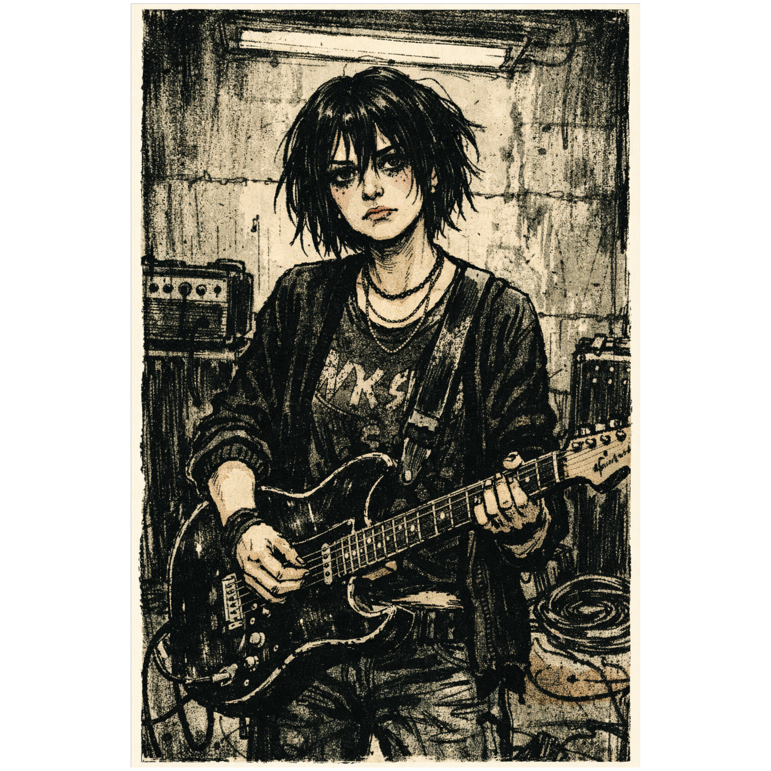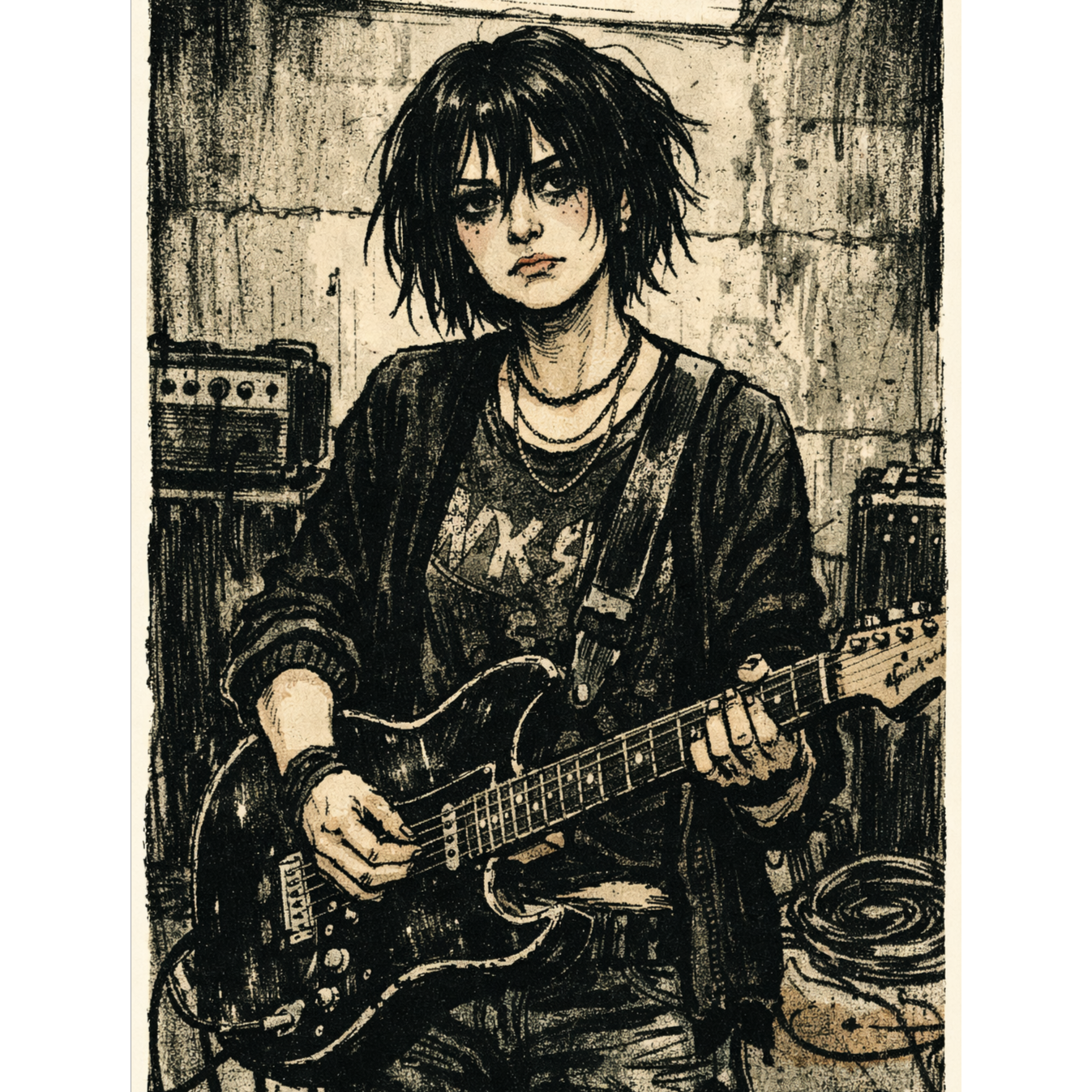 Lo-fi goth-rock and garage post-punk with a raw, cheap-studio sound, Dry, close-mic’d female vocals with strong Parisian French accent; soft, slightly raspy tone with natural imperfections, breath breaks, and light pitch drift, Verses are quiet and hesitant, choruses louder and distorted, with over-articulated French vowels, Guitars are fuzzy and thin with rough chord changes and small timing slips; bass is warm and slightly overdriven with simple repetitive grooves; drums are boxy and live with ringing snare and crashing cymbals that clip the mix, Production feels like a small rehearsal studio—narrow stereo image, tape hiss, distortion, and mic bleed, Mood is dark, youthful, romantic, and melancholic, capturing the raw energy of a local band still learning its power, ‑Over-produced or modern pop polish, ‑electronic or synth-based elements, ‑ambient pads, ‑dream-pop or shoegaze shimmer, ‑reverb-heavy vocals, ‑clean hi-fi studio mix, ‑tight quantized drums, ‑808 or trap percussion, ‑EDM or dance textures, ‑wide stereo imaging, ‑layered harmonies or vocal stacks, ‑bright chorus effects, ‑modern indie-rock sheen, ‑digital autotune correction, ‑orchestral or cinematic scoring