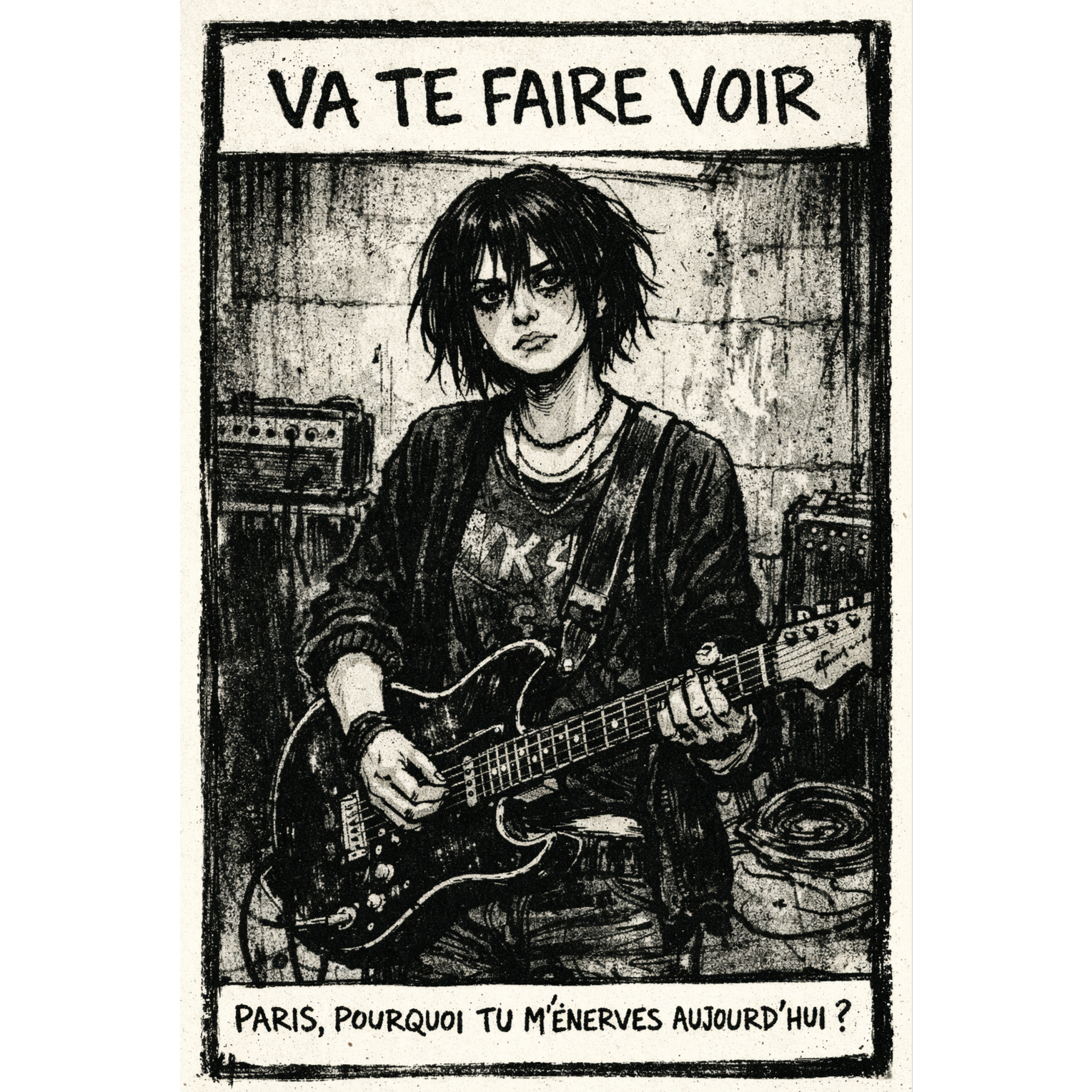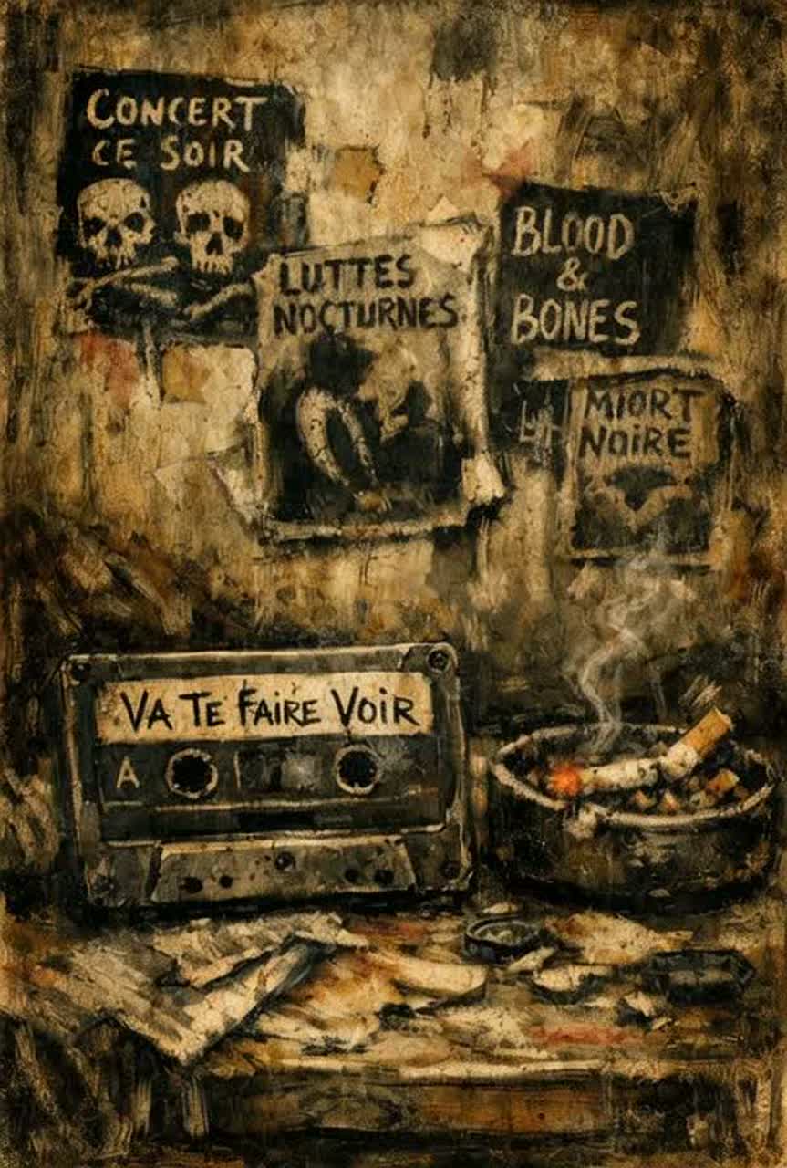 1993 lo-fi Parisian goth-rock and garage post-punk inspired by underground cassette demos, Small live band feel with dry, close-mic female vocals sung in French with a Parisian accent, unpolished delivery, slight nasal edge, uneven phrasing, and snotty, confrontational attitude, Guitars are thin and brittle with simple repetitive chord patterns, no lead riffs or layering, Bass is warm and slightly overdriven, following root notes with loose timing, Drums are boxy and live, recorded in a small room with minimal fills and imperfect dynamics, Production is raw and narrow with light tape hiss, no modern polish, no stereo tricks, Mood is bored, sneering, angsty, and unresolved—teenage frustration delivered with confidence rather than reflection