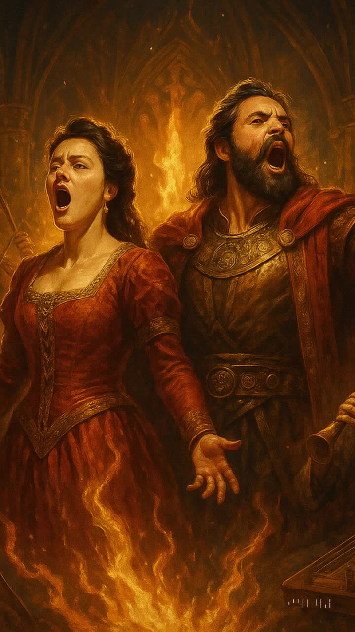 Epic Symphonic Rock Opera, Do minor, fast tempo, cello, violin, viola, timpani, cymbals, french horn, bağlama, kemençe, ney, zurna, kanun, davul, darbuka, operatic male & female soprano vocals (Italian opera style), dramatic phrasing, powerful baritone choir (mixed gender), no electronic instruments, Game of Thrones-inspired melody, Turkish instruments prominent in orchestration, theatrical dynamics, Latin chants, final crescendo