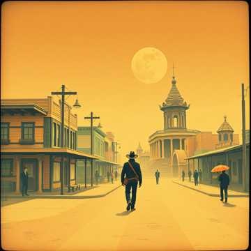 quirky dark spaghetti western, strong bass, electric guitar, whistle, violin, trumpet