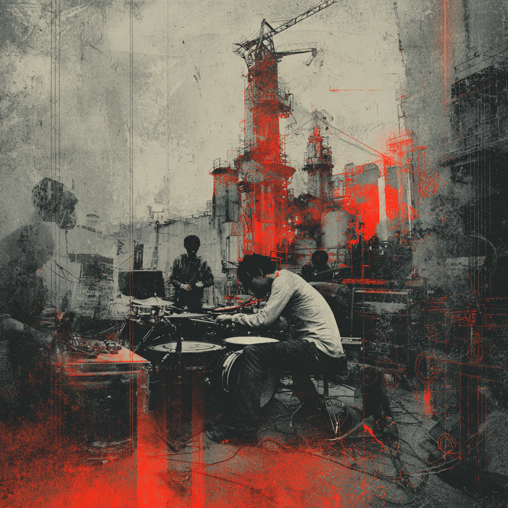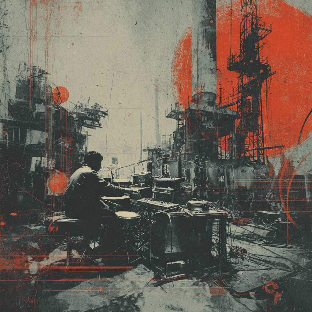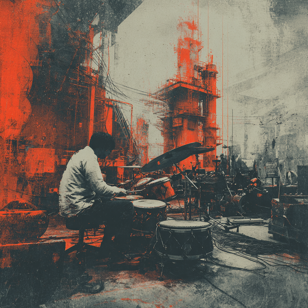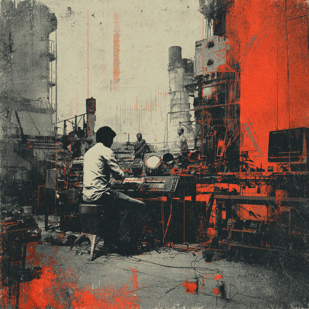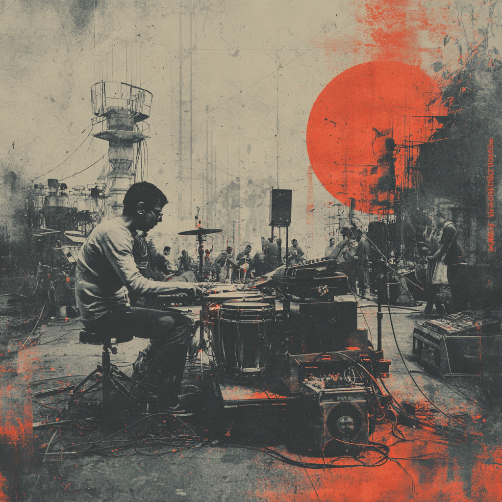 A bold fusion of industrial and Indian classic raga, opening with textured metallic percussion and processed machine sounds beneath a droning tanpura, Sitar and tabla interplay over mechanical synth basslines, building tension in the verses, The chorus erupts into distorted drum loops tangled with rapid-fire tabla, while airy synth pads support intricate raga-inspired melodies, A hypnotic outro layers sampled chants over evolving industrial rhythms, ‑pop, ‑pop music