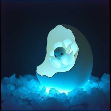“Ethereal alien creature made of translucent white petals and glowing light, newly hatched from a cracked cosmic egg under starry night sky, luminous blue-white tones, dreamlike wonder mixed with fragile isolation, slow glacial ambient, crystalline pads, distant choirs, subtle granular textures, vast reverb, 50 BPM, minor key with occasional hopeful major lifts, dark ambient neoclassical style”