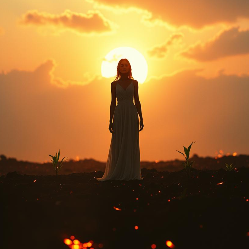 Create an emotional Nordic metal ballad at 75 BPM with soft folk elements and cinematic production, The female lead vocal should be intimate, proud, and deeply emotional — singing from the ruins of Ragnarök as a survivor and witness, Include harp, clean acoustic guitars, soft Nordic percussion, atmospheric wind textures, and orchestral strings that swell gradually, The verses are gentle and narrative, telling of devastation and quiet hope, The choruses should bloom into full epic choir moments with layered harmonies, warm pads, and emotional depth, Add a melodic guitar solo in the bridge, folk-inspired, with strings swelling behind it, End with a solemn choral outro fading into harp and nature sounds, The mood is mythological, reflective, and healing — symbolizing the rebirth of a world once lost