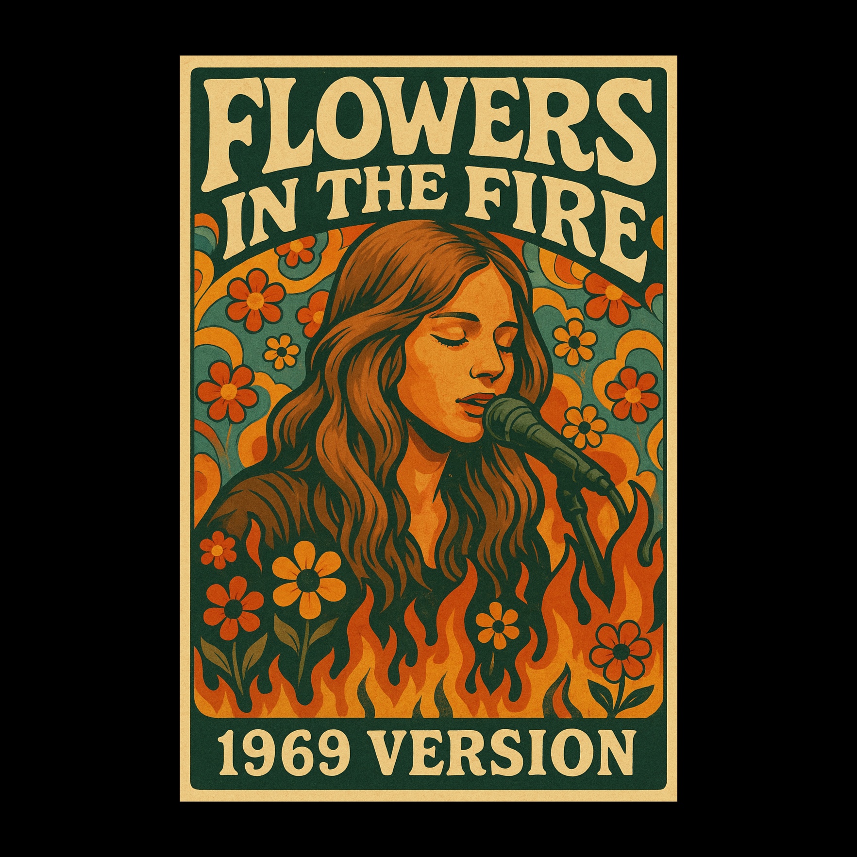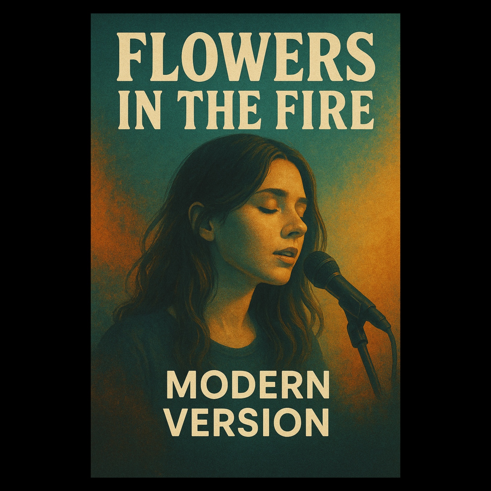 Modern psychedelic folk-pop song with acoustic guitar, ambient synths, tribal drums, layered male & female vocals, and rich vocal harmonies, Uplifting yet melancholic mood, Evokes the spirit of Woodstock with a contemporary twist – themes of peace, protest, nature, and spiritual awakening, Field recordings of nature (rain, birds, distant crowd cheers) subtly blended in, Tempo: slow to mid, emotional and atmospheric, ‑Flowers in the Fire new style