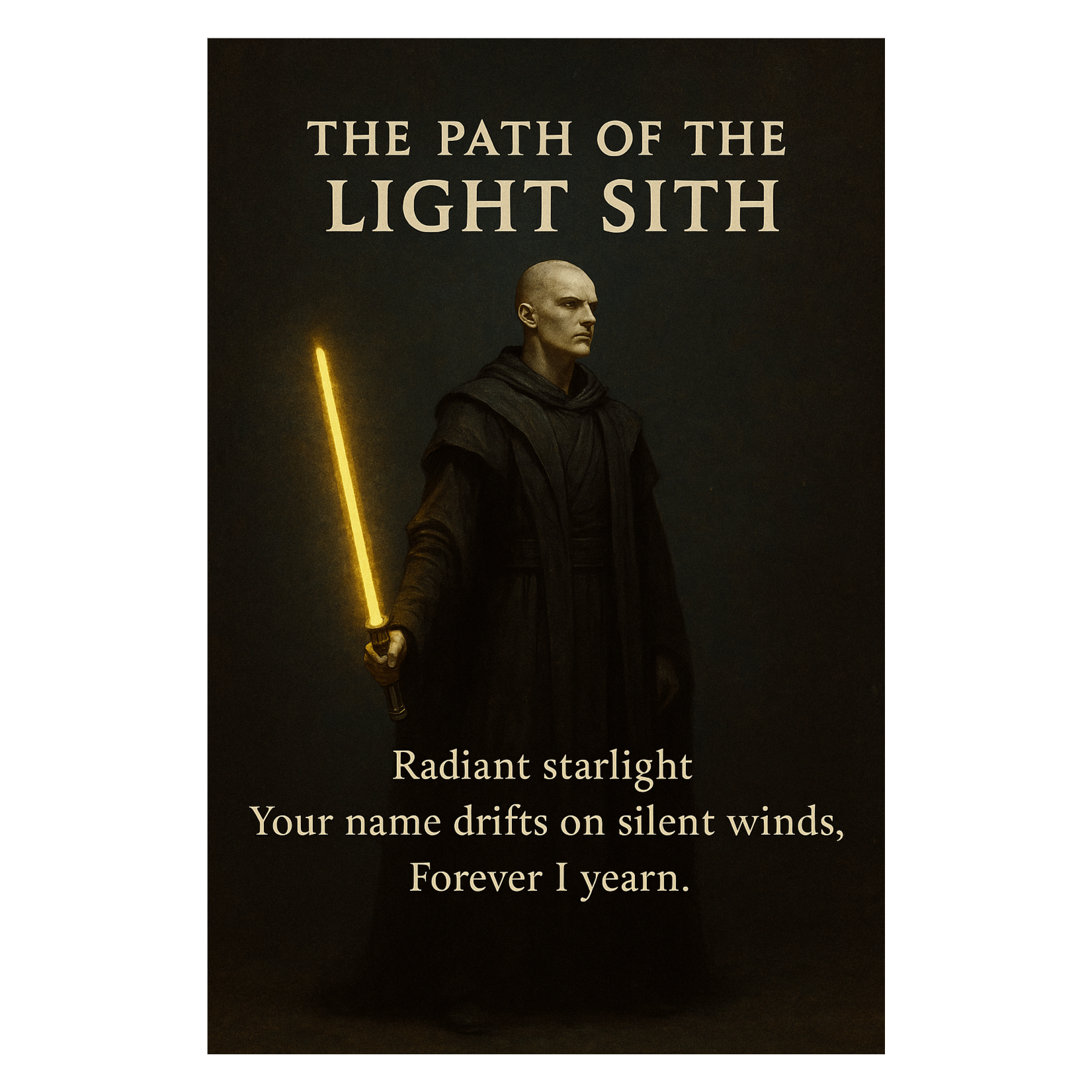 Epic cinematic soundtrack, Star Wars inspired, Dark and powerful, yet uplifting, with orchestra, choir, heavy drums, and synth undertones, Blend of John Williams (Star Wars) and Two Steps From Hell, Instruments: Full orchestra, choir (male + female voices), strong percussion, deep strings, subtle electronic atmosphere, Mood: Majestic, dark but hopeful, philosophical, like an anthem of a Grey Sith or Force-wielder who transcends both Jedi and Sith, Prompt (English for Suno):