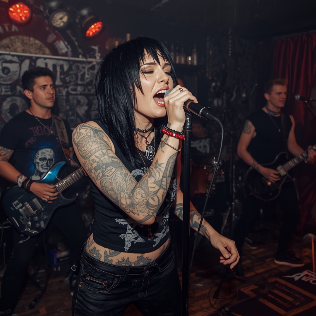 punk-pop hard rock, early 1980s, 138 BPM, E major, straight ahead 4/4 no shuffle, power chords throughout slightly overdriven dry and punchy, Les Paul Junior tone, bass doubling guitar riff locked tight, four on the floor kick drum snare cracking 2 and 4, snare every beat on chorus doubling urgency, tight fast hi-hat verses, no wah no effects guitar solo straight overdriven pentatonic 8 bars, female lead vocal chest voice raw edge flat confident delivery attitude locked at the jaw no vocal runs no acrobatics, gang vocals chorus mixed male and female rough unpolished muscling the hook not sweetening it, full stop one beat silence before bridge, bass and drums half tempo bridge two lines near spoken, band snaps back full speed final chorus, hard stop ending no fade single power chord cut dead, radio ready but teeth showing, no synthesizers no keyboards no modern production, analog punch, recorded live and loud