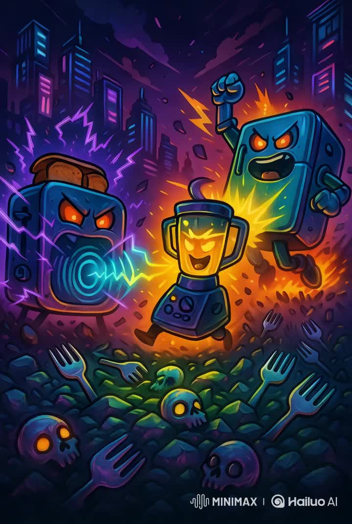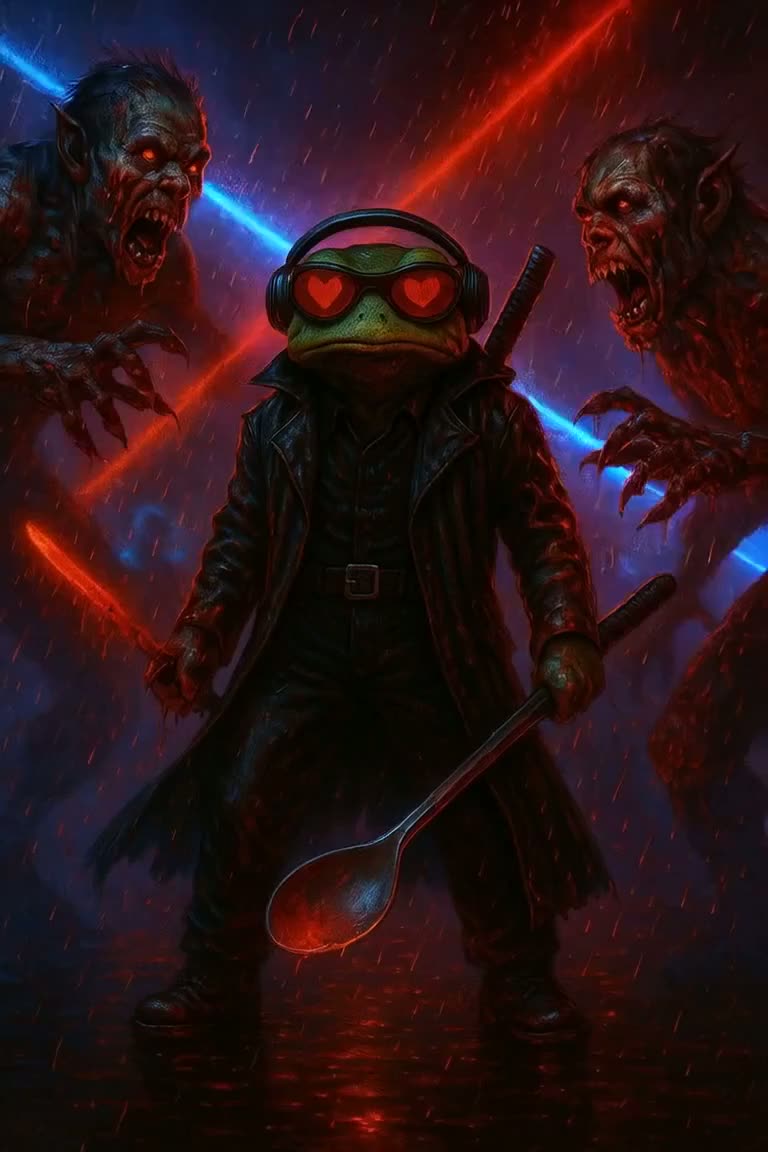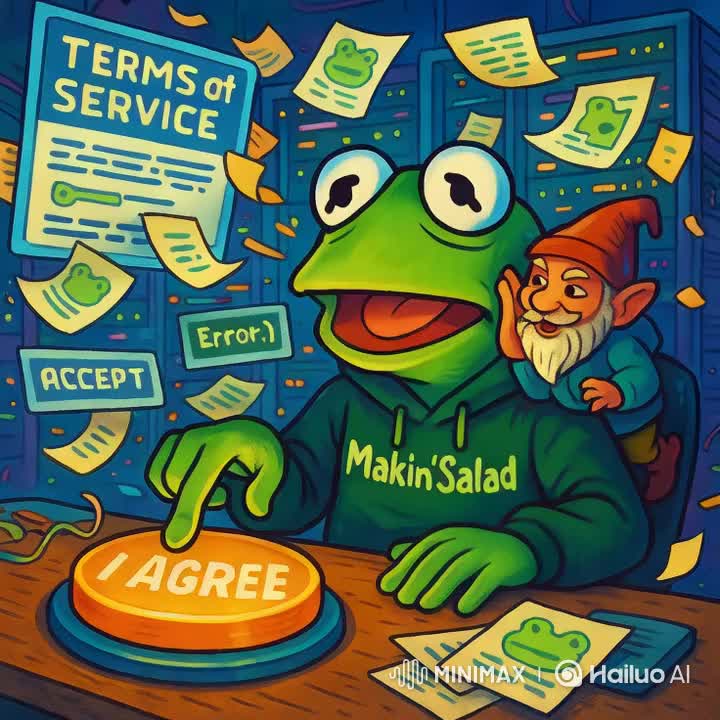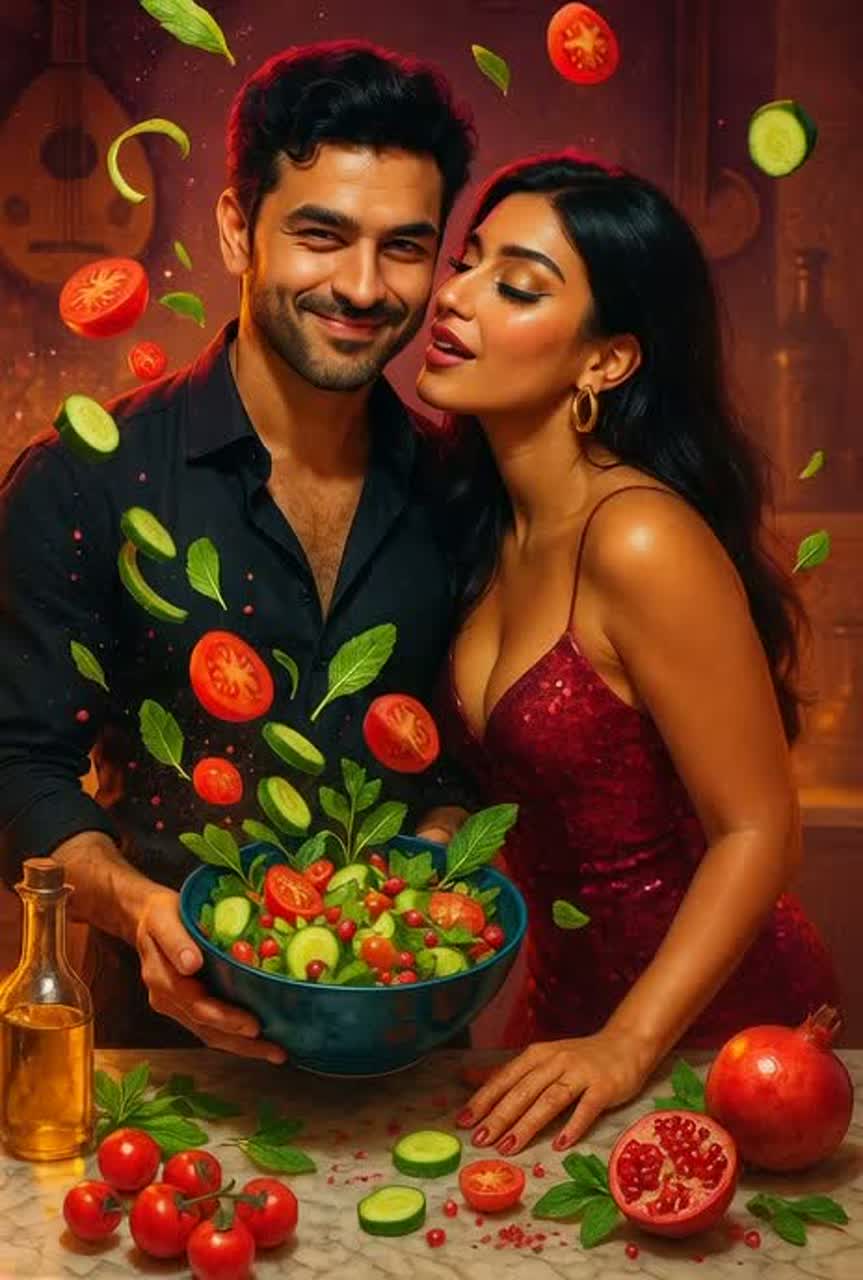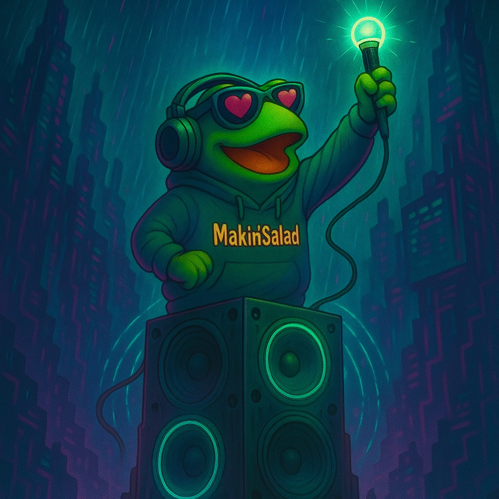 Fast glitch-trap banger, 180 BPM, blending sinister chopped vocals with uplifting creativity-driven lyrics, Hard 808s and distorted basslines mimic the sound of knives and chopping boards, while glitch FX twist words into stutters, Vocals alternate between rapid-fire delivery, chant-like hooks, and whispered interludes, The vibe is both playful (salad persona) and inspiring (creativity as art), mixing humor with meaning, A cyberpunk-club anthem that celebrates originality