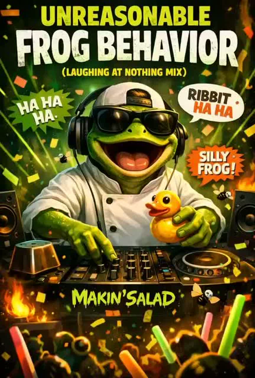 Sparse, punchy drums kick off the Minimal Techno groove at 126 BPM, layering quirky, off-kilter synth stabs with pitch-shifted male vocal chops mimicking rhythmic laughs, Rubber-band bass pulses under bubbly FX and croaking, frenetic vocal samples, giving the track bouncy “frog energy” throughout