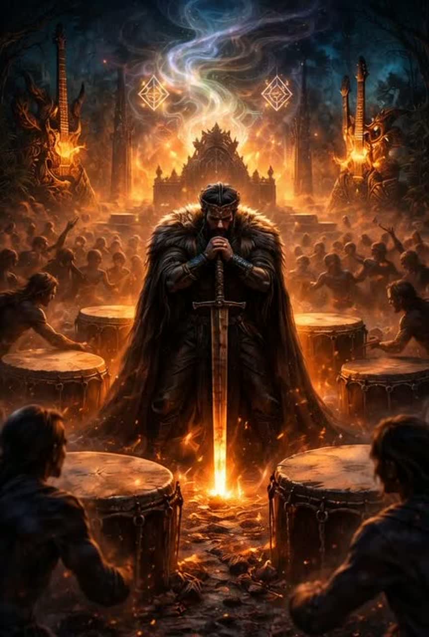 This industrial techno track opens with ritualistic drums and metallic clangs, weaving in trance synth motifs that evoke Norse myth, A warrior-voiced narration rides over pounding rave bass, Dense pads mimic fog, and stoic, minor-mode melodies merge ancient resolve with Berlin’s 2000s rave grit
