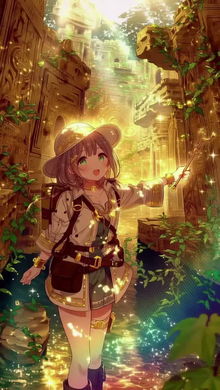 Bossa Nova magical adventure, gentle playful rhythm, soft acoustic percussion, smooth jazzy chords, Latin guitar plucks, upright bass, warm saxophone melodies, deep cello, Middle Eastern instruments: Oud, Ney flute, Darbuka, Qanun, airy synth pads, sparkling sunlight on golden ruins, original spell echoes: Luxio, Restaurare, Portare, wandering overgrown stone corridors, discovering hidden treasure, curious footsteps, dreamy swinging 90 BPM, continuous single-section, enchanting, whimsical, adventurous, golden-hued mood