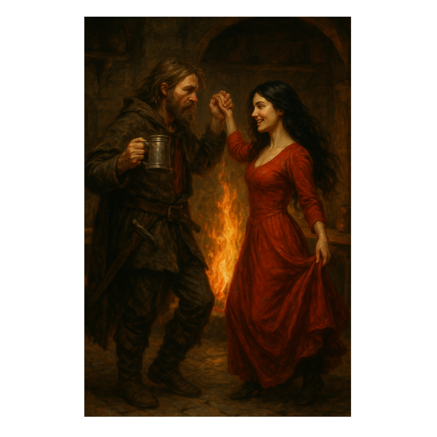 Medieval-Folk-Rock with playful, rhythmic acoustic guitar, driving hand percussion, and bright mandolin lines, Warm, weathered lead vocals deliver catchy verses, After Strophe 3, a long instrumental features lute, recorder, and electric guitar weaving lively counter-melodies before a lively final chorus