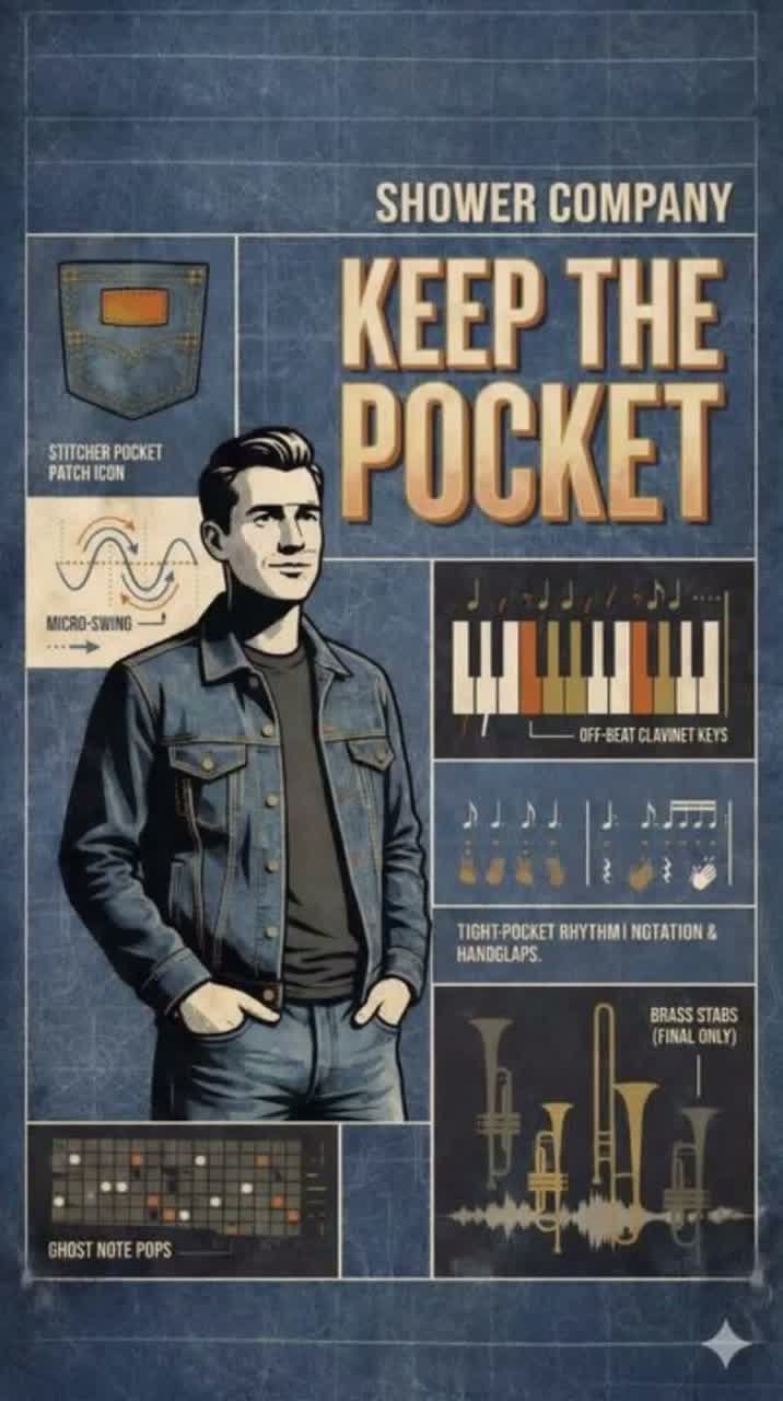 110 BPM, G minor, Tight-pocket minimal funk rock with dry, skeptical cool, Drums and fingerstyle bass lead the groove; muted wah guitar 16ths and clavinet fill the gaps, Use shakuhachi as rhythm, not melody: short breathy stabs, clipped tails, inhale-like accents, off-beat replies, Male baritone vocal stays dry and centered, semi-spoken in verses, lightly sung in chorus, Keep energy restrained and body-led, Bridge strips to kick, bass, muted guitar scratches, and shakuhachi breath pulse; final return adds only a small lift and sparse brass, Clean low-mids, control harsh upper mids, separate kick and bass, avoid brittle highs and over-compression, shakuhachi works as beat punctuation: breath stabs, short off-beat cuts, percussive answer phrases, Mood, Genre Tags: tight pocket, minimal funk rock, satirical groove, rhythmic shakuhachi, dry vocal, adult cool, restrained chorus, subtle tension, observational funk, polished-but-off