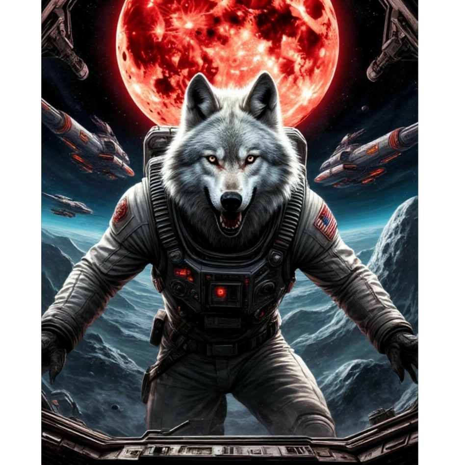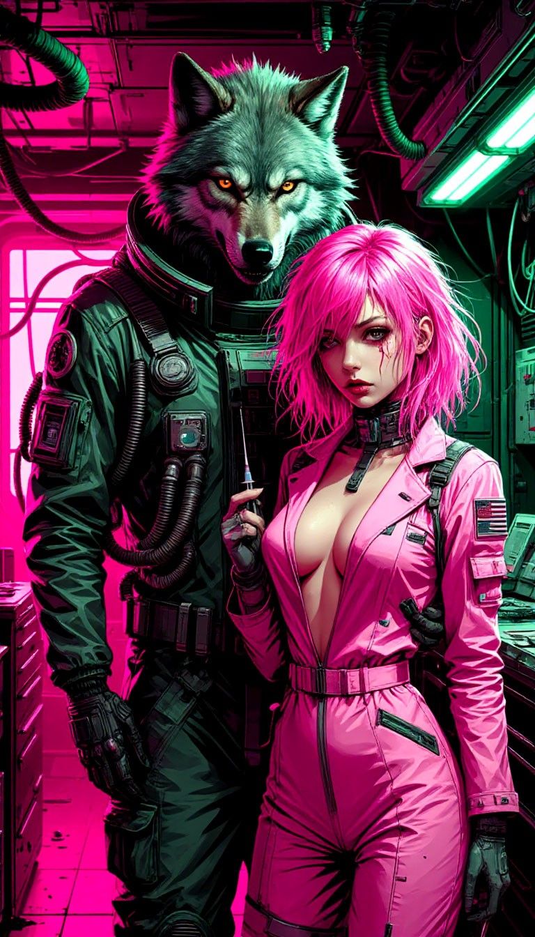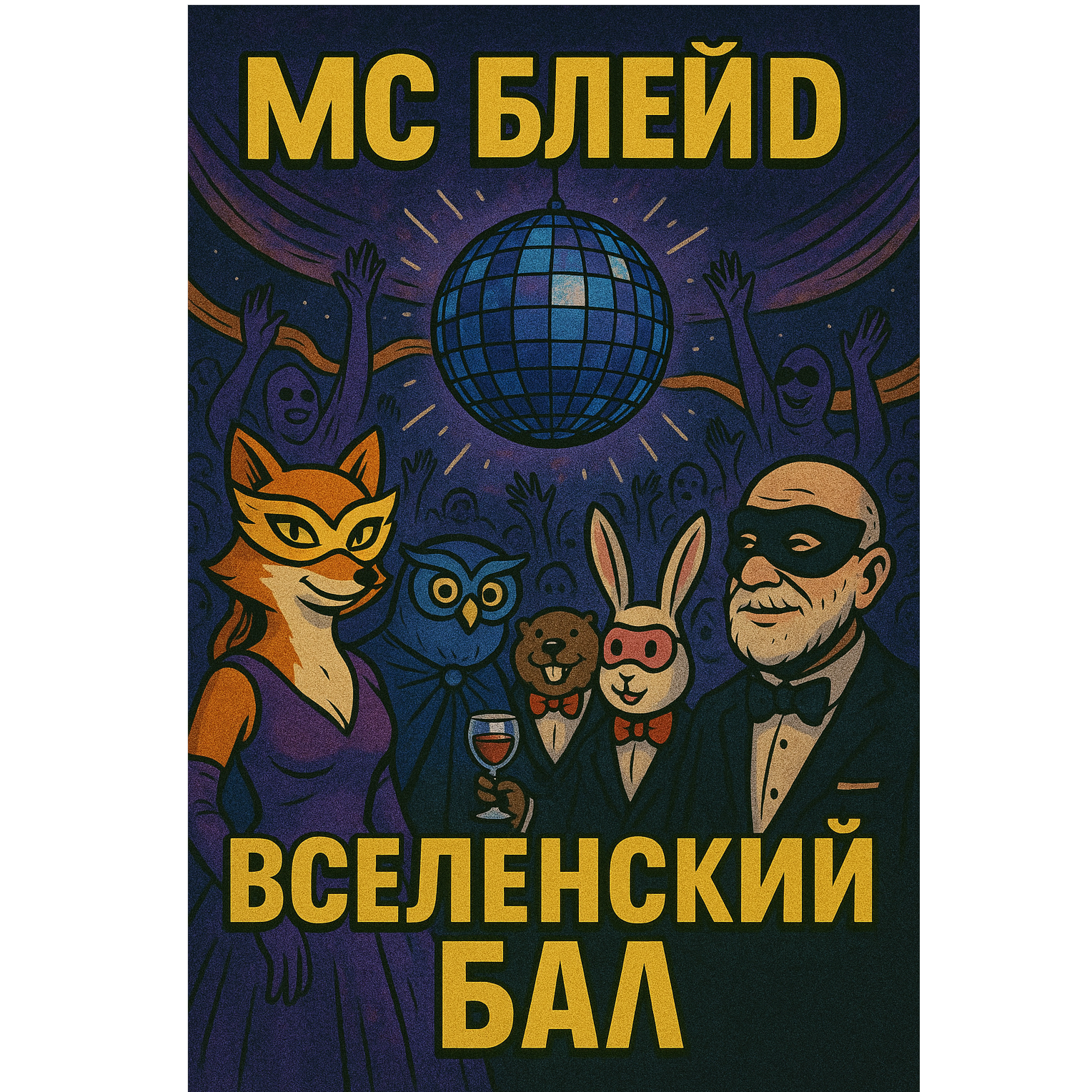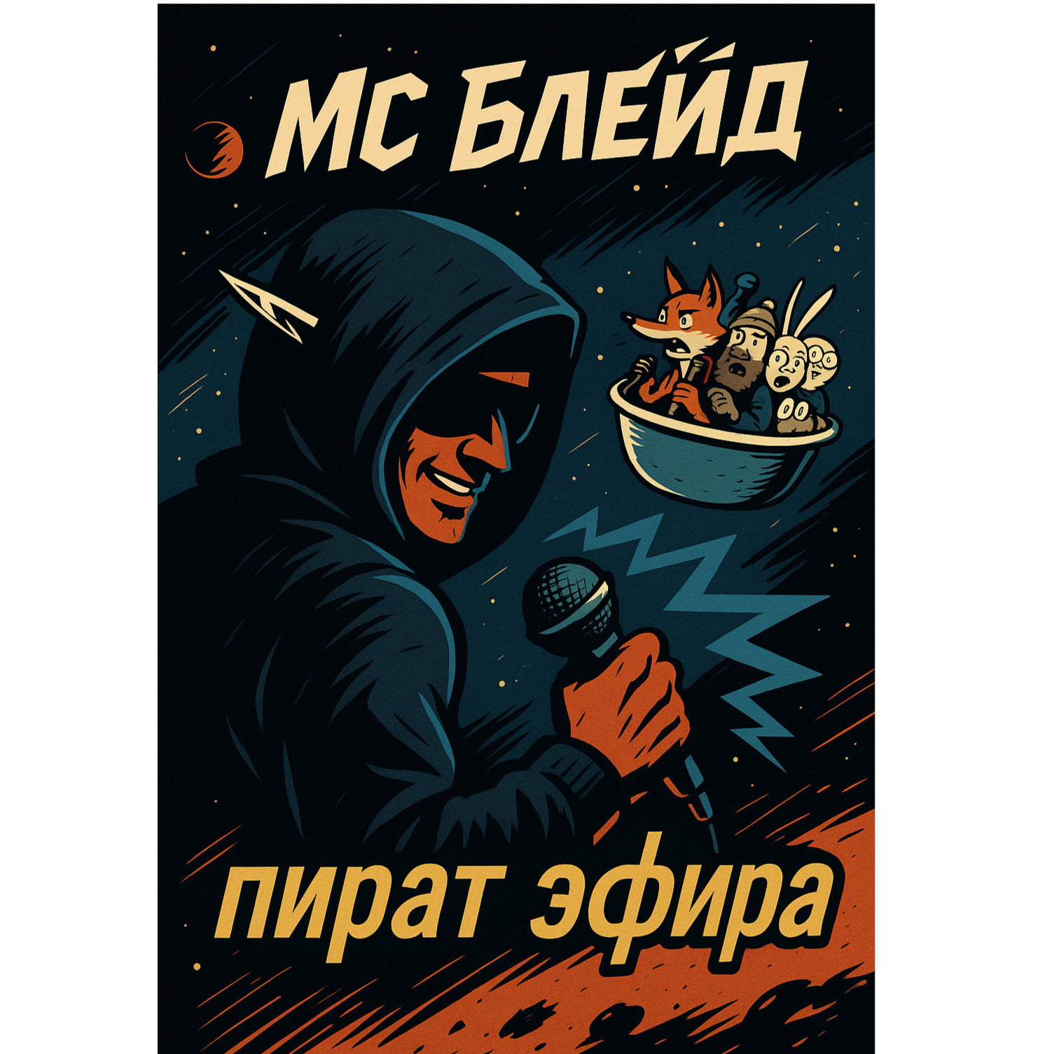 A surreal theatrical performance blending smoky cabaret and fast Russian rap, The intro and ending are in the style Brechtian cabaret, and old sci-fi jazz, with spoken-sung baritone vocals and dramatic piano, In the middle verses (5–7), the wolf character raps in a chaotic freestyle — fast-paced, slightly deranged, over a distorted beat, The whole track feels like a drunken space opera on a pirate ship