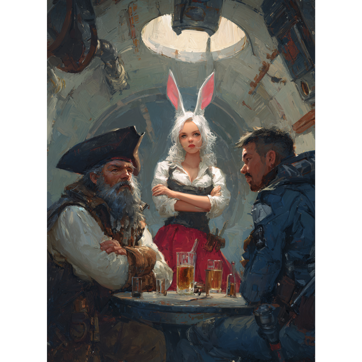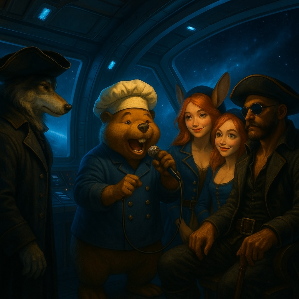 Imagery: rusty spaceship bars, zero-gravity brawls, cosmic sea shanties
