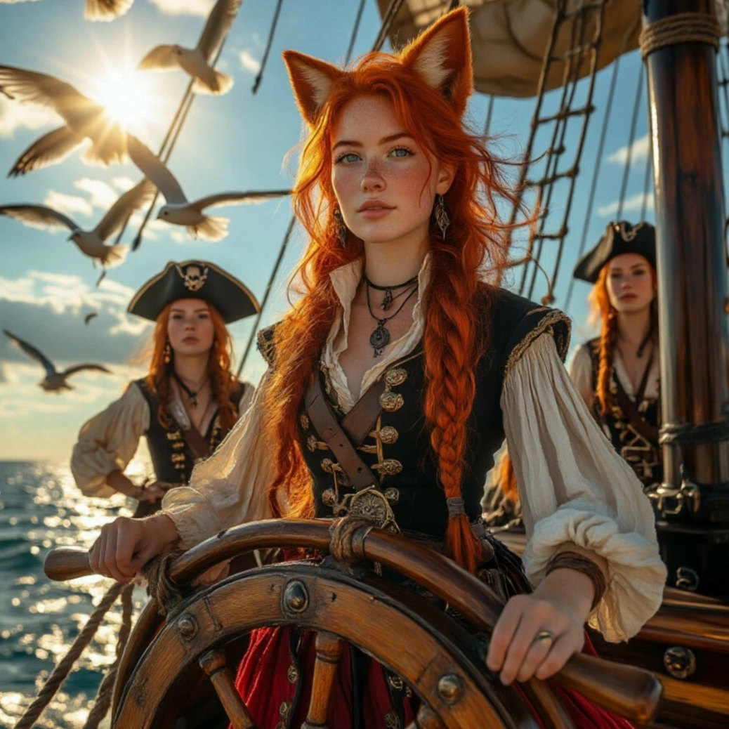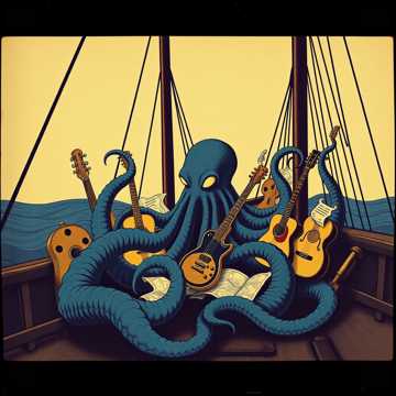 Sea folk rock with elements of gypsy tambourine and jazz improvisations, the atmosphere of a pirate ship, adventure, and mystery, and a humorous mood, The main rhythm is a cheerful marching beat in 4/4 with accents on strong beats, creating the feeling of a ship moving through the waves, The use of folk instruments (tambourine, drum, and violin) adds to the maritime atmosphere, The inclusion of jazz elements (saxophone or trombone) enhances the expressiveness of the solos, The vocals are rich, with a maritime undertone, and slightly rough to emphasize the adventurous spirit