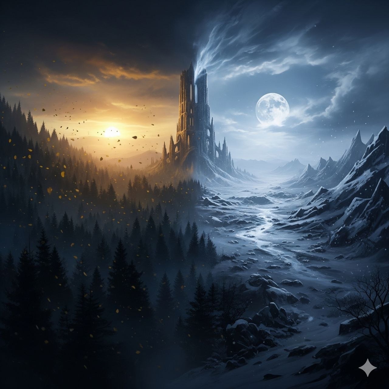 Vocal Architecture: Constant dual-vocal delivery, strict male-female unison throughout, no alternating lines, no solo vocals, Male: deep cinematic baritone, clean, powerful, grounded, Female: soft ethereal soprano, ghost-like, blended as an instrument, singing identical melody and timing as male, Instrumentation: Symphonic Black Doom Metal, slow-to-mid tempo (80 BPM), Massive orchestral-driven sound, thick layered low-tuned distorted guitars, crushing sustained riffs, deep dominant bass, Full cinematic orchestra: heavy low brass (trombones, tubas), dramatic strings, dark violin, gothic choirs in background, Heavy slow punchy drums, powerful snare, immersive cold ambient pads, Atmosphere & Mood: Dark philosophical, melancholic, cold and grim beauty, crushing orchestral weight, slow overwhelming flow, cinematic score intensity, high dynamic tension, layered and immersive textures, epic scale, inner strength, Professional studio recording, crystal clear mix, high-fidelity audio