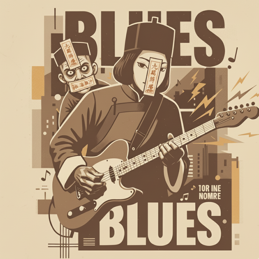 Slow-bounce tempo with deep bass, heavy percussion, and layered male & female vocals, Wah guitar adds dark, wavy rhythm — not funky, but eerie and hypnotic, Choir harmonies echo like a haunted cathedral, blending male low voices and female high whispers, The song feels like a cursed festival under the moon — dark, cinematic, seductive, Include ghostly chants (“キョンシー!ファンシー!クレイジー!”) with long reverb tails and spooky atmosphere