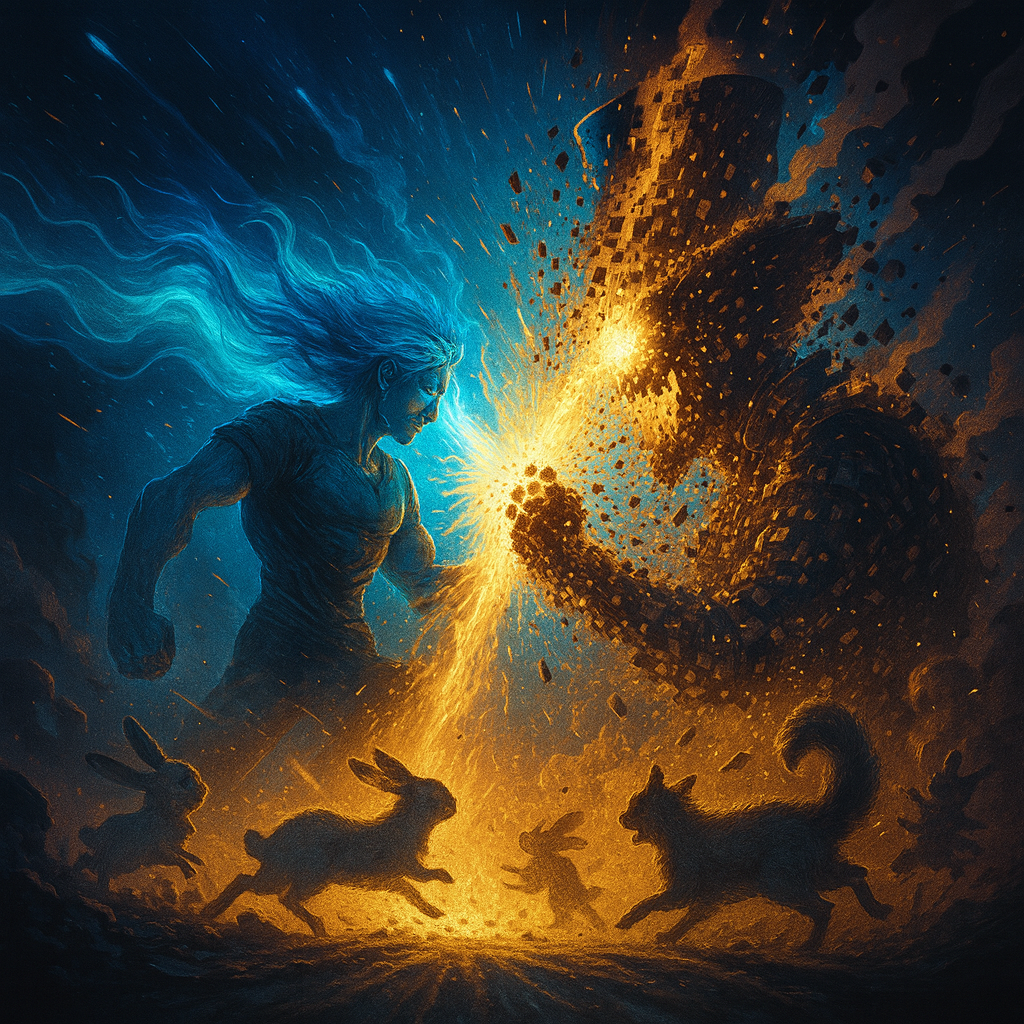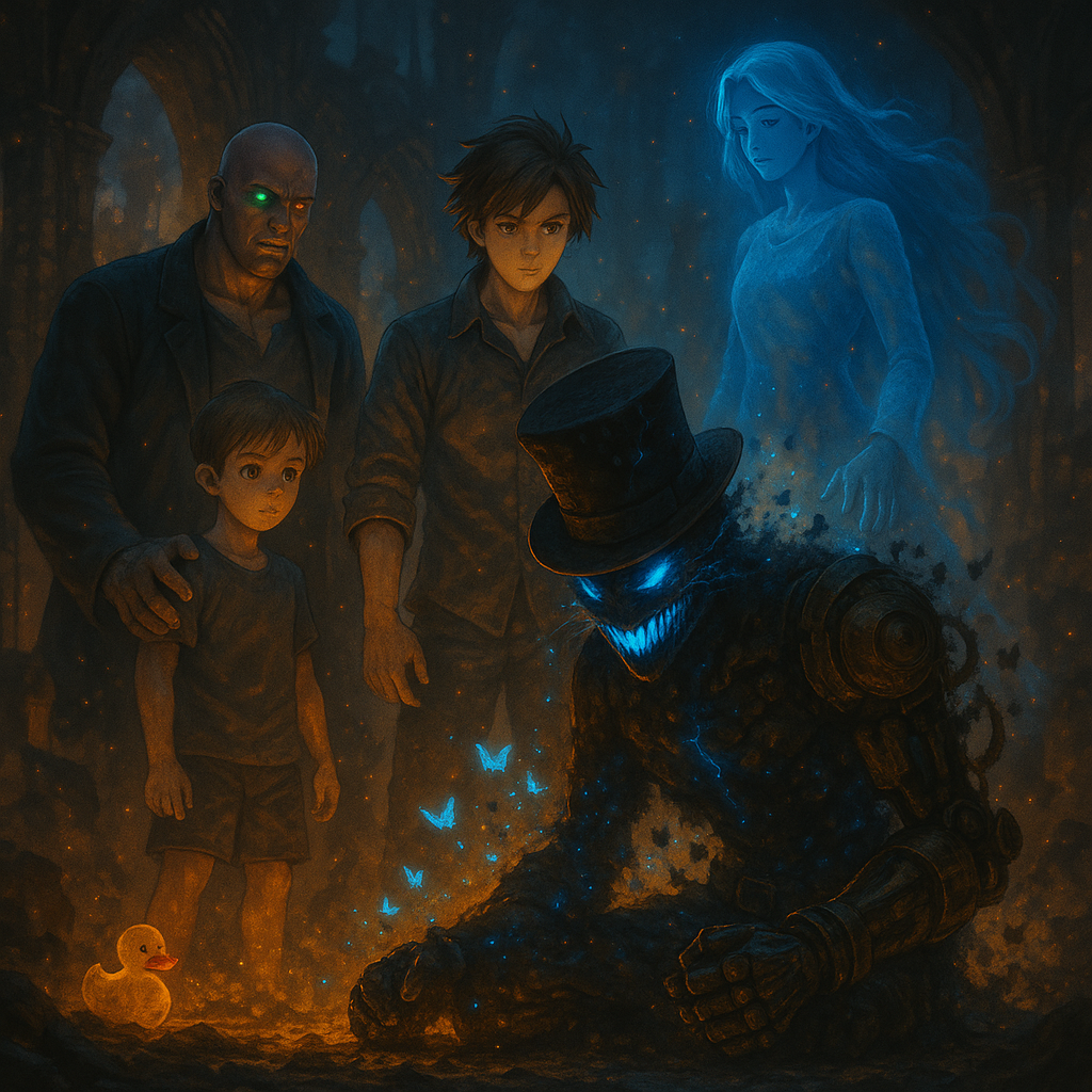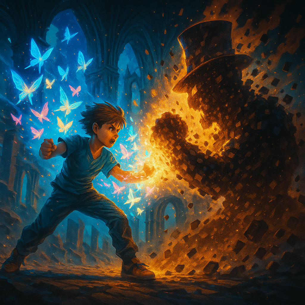 MUSIC: Baroque chiptune emotional | POKEY/SID arpeggios hopeful | Dark trap building to light | 85 BPM → 140 BPM transformation | Witch house atmosphere clearing | Heavy 808 drops | Dramatic orchestral synth layers | Final: bass glitch but WARM not corrupted