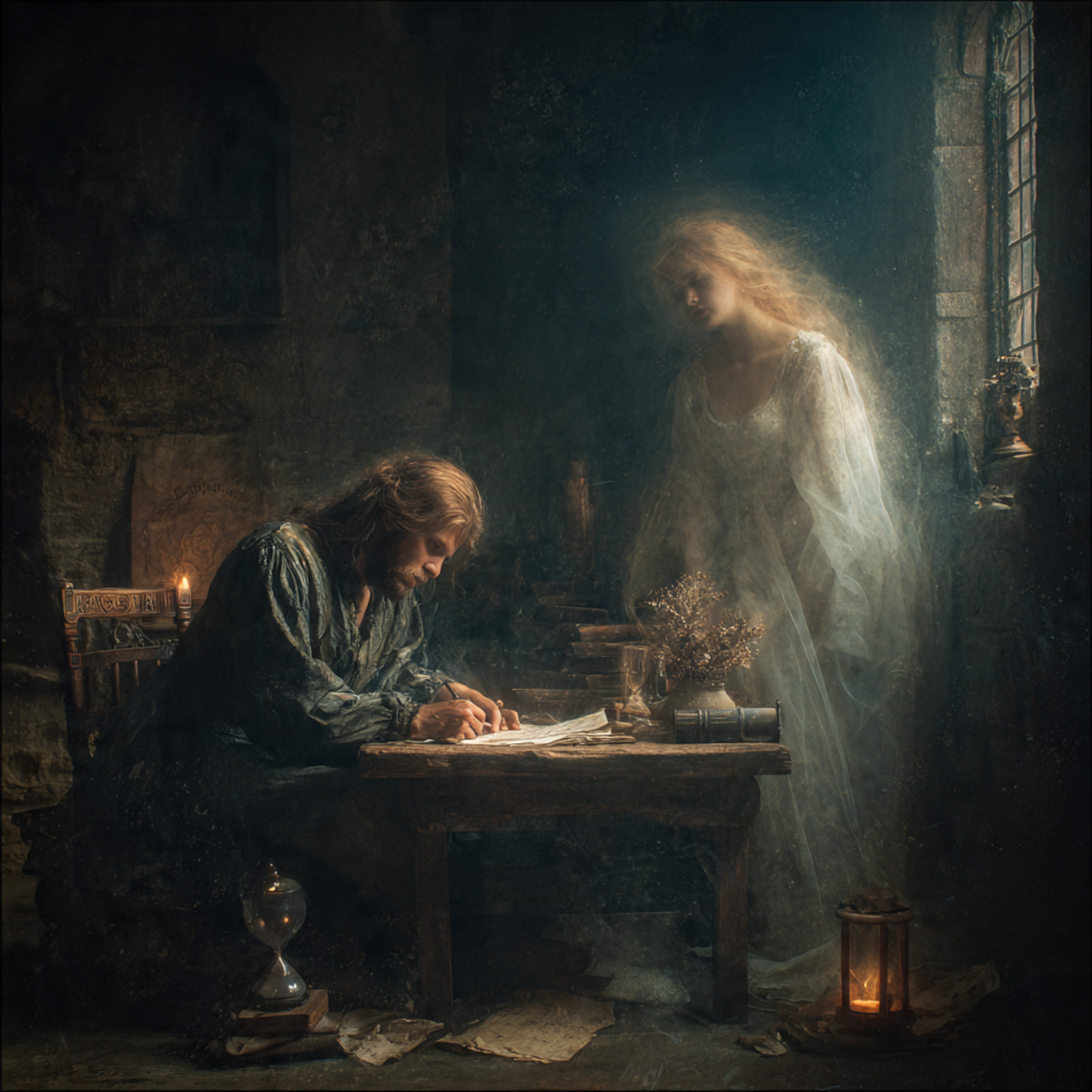 verse as a troubadour's lament, Use enchanting medieval style, sorrowful tone, melodic stanzas, and expressive vocabulary to evoke longing Stay true, expressive male voice, narration introspective