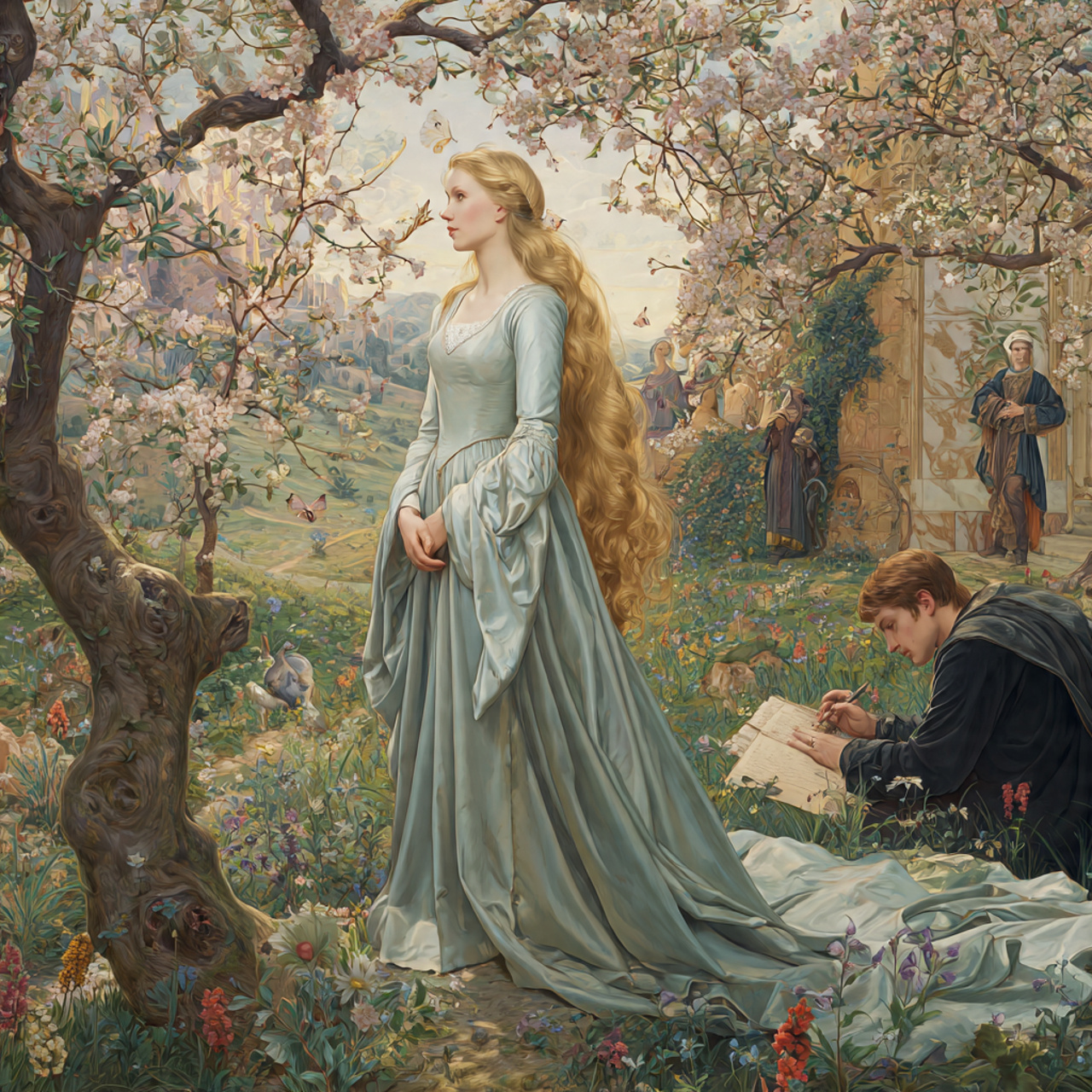 Style: intimate medieval ballad], [Mood: contemplative, tender, luminous], [Voice: mature male voice, slow and expressive], [Instruments: lute, bowed viola da gamba, subtle harp], [Effects: natural reverb, warm echo, slow pacing to extend short lyrics], [Structure: [Verse 1] [Bridge instrumental] [Verse 2] [Outro slow fade]], [Language: French], [Tags: Petrarch, poetic minimalism, spring, divine love, ancient gift, noble expression, paradise roses
