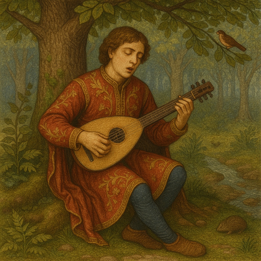luth et flûte en contrepoint, troubadour style, expressive male voice, narration introspective