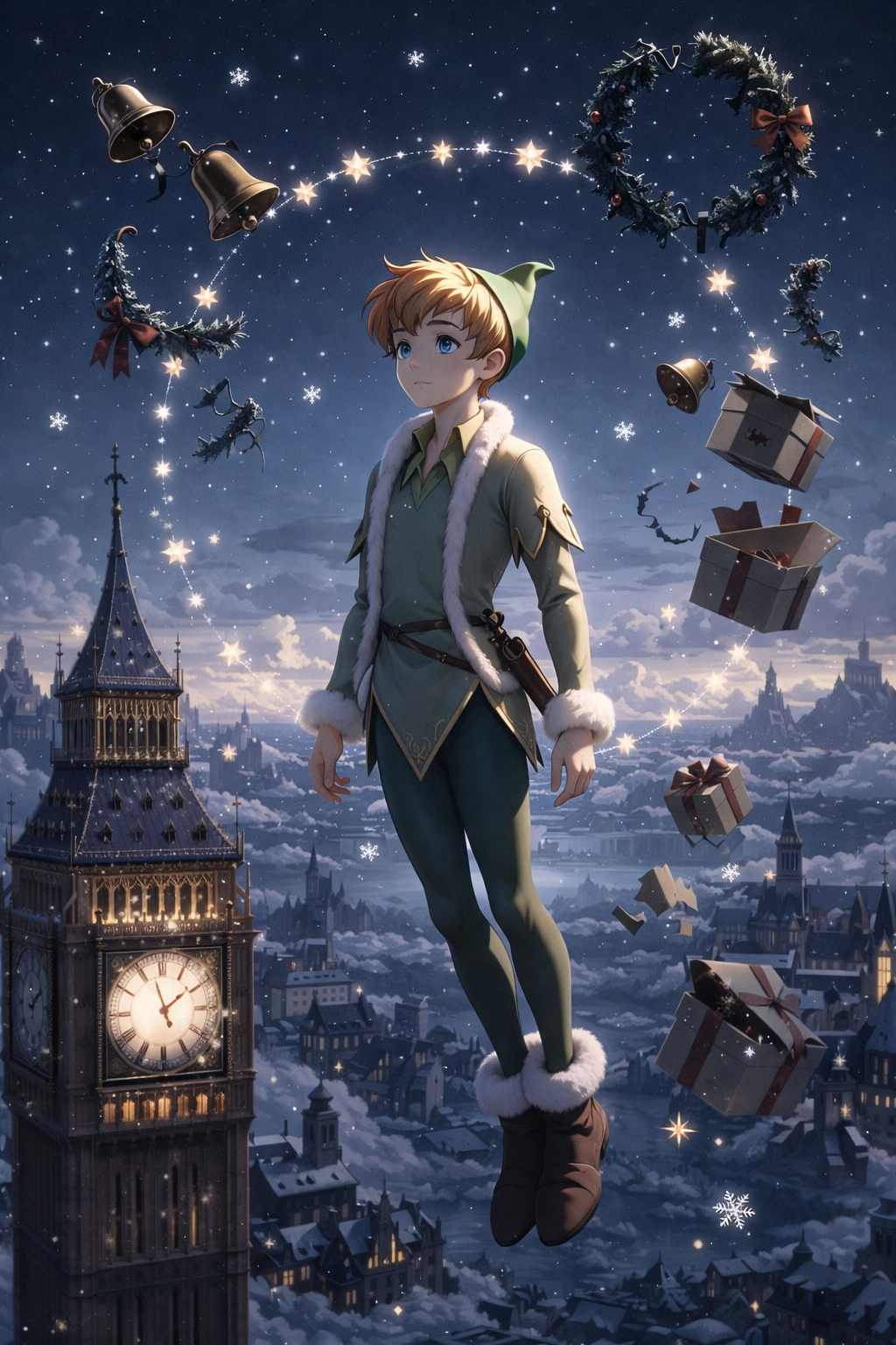 Dreamy fairy pop, soft anime pop, floating rhythm, twinkling bells and glockenspiel, youthful male vocal, nostalgic but cute, bedtime story mood, magical Christmas night, gentle and hopeful