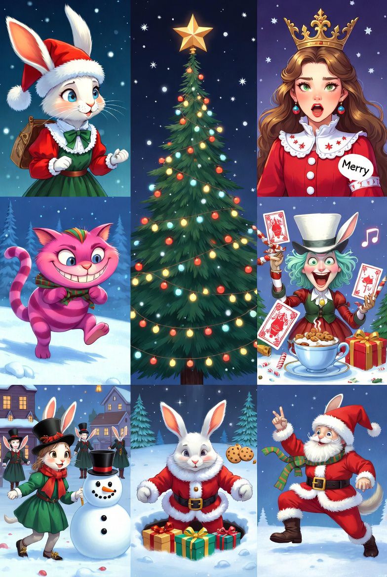 EMO Rock with alternative influences and piano emo vibes, Emotional male/female vocals with raw, heartfelt delivery like early 2000s emo bands, Driving electric guitars for the verses and choruses, but heavy on melodic piano intros and bridges for a nostalgic, introspective feel, Upbeat tempo around 140 BPM to keep it festive and happy, with building energy toward the chorus, Add subtle holiday bells and synths for Christmas magic, but keep the overall tone whimsical yet emotionally charged—like a dreamy Wonderland holiday adventure
