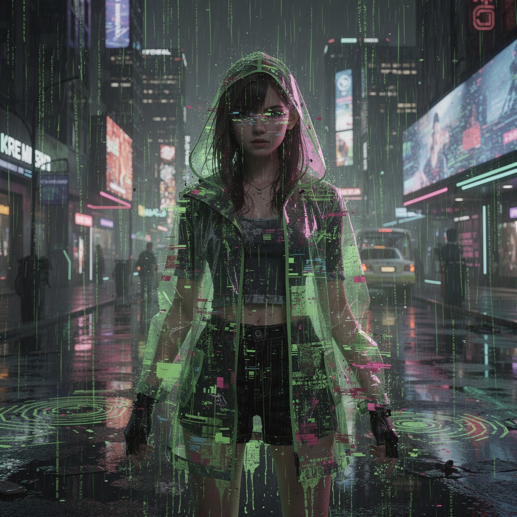 Hyperpop and glitchcore track featuring processed male vocals with heavy pitch correction and bitcrushing effects, The instrumentation consists of a distorted 808 bass, a sharp digital snare, and a high-pitched synth lead playing a repetitive staccato melody, A prominent glitch effect occurs periodically, creating rhythmic stutters and digital artifacts, The tempo is 160 BPM in the key of C major, The percussion uses a trap-influenced pattern with rapid hi-hat rolls and a heavy, saturated kick drum, Synthesizer pads provide a bright, shimmering texture in the background during the chorus sections, grunge, female singer, guitar, math rock, synthwave, melancholic catchy glitch pop