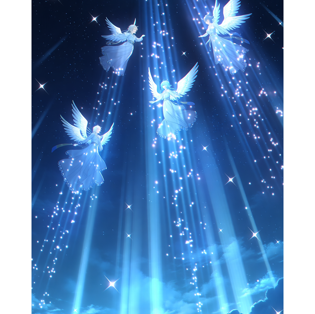 A celestial soundscape blending ethereal synth pads, harp glissandos, and glitchy percussion forms the core, Unconventional, processed male vocals float above, layered with ghostly choirs, Fragmented melodies weave through uneven song sections, creating an eerie yet blissful effect