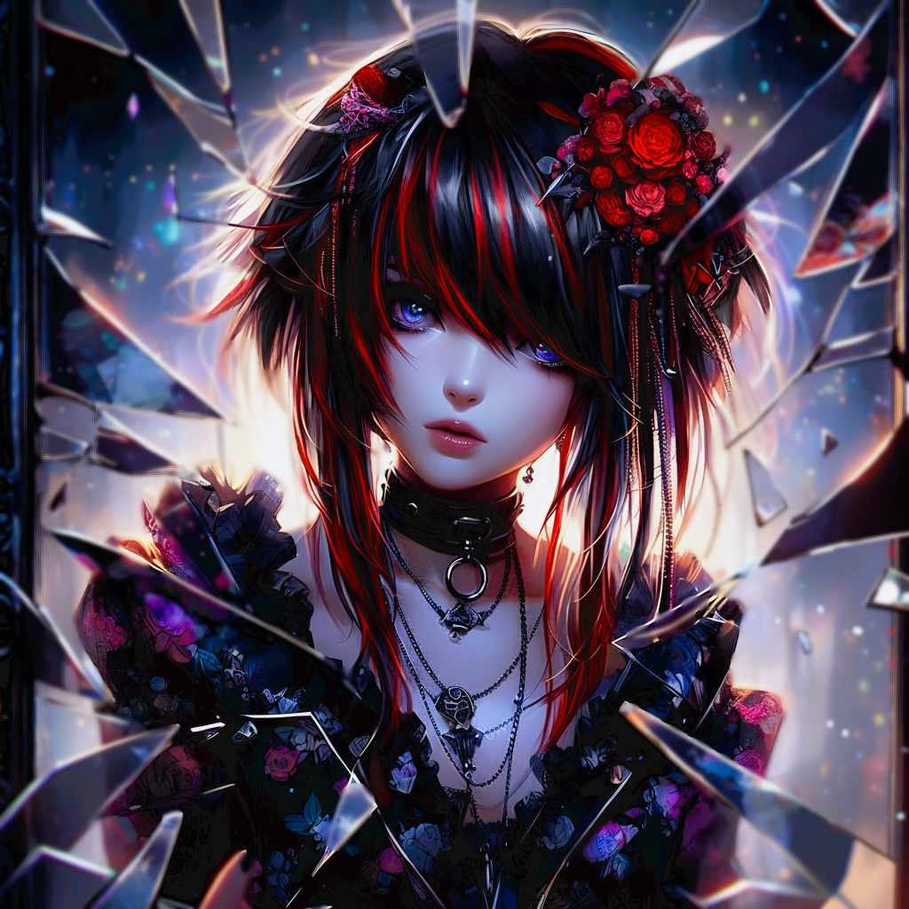 [Genre: Gothic rock, Visual kei, Anime song], [Instrumentation: Twin guitar, Heavy bass, Double bass drum, Strings, Synthesizer, Organ], [Voice quality: Female metal vocal, Trembling and brooding vocal, Husky yet clear resonance with fragile breath-infused timbre and dynamic rasp-to-vibrato shifts], [Vocal Range: F3–A4, grounded lower midrange with haunting upper transitions], [Atmosphere: Uplifting, Passionate, Intense, Dirty, Emotional, Vivid, Dynamic, Cool, Powerful, Aggressive], [High Resolution, Clear and Heavy sound]
