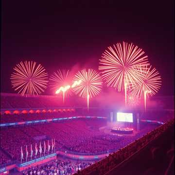 Indie Pop song performed live in a big stadium, Start with loud cheering crowd sounds and announcer saying "Berlin, are you ready?", Then the band counts in "One, two, three, four!" and plays a bright, upbeat Indie Pop groove with live drums, bass, guitar, and vocals, Include audience clapping and singing along on the chorus with stadium reverb, Lyrics about shining together, dreaming big, raising hands, staying forever young, Add a bridge with a call-and-response "Oh-oh-oh" chant with the crowd, Finish with the audience cheering and the singer thanking them: "Thank you! Goodnight!", Energetic, feel-good, anthemic, perfect for a live concert vibe